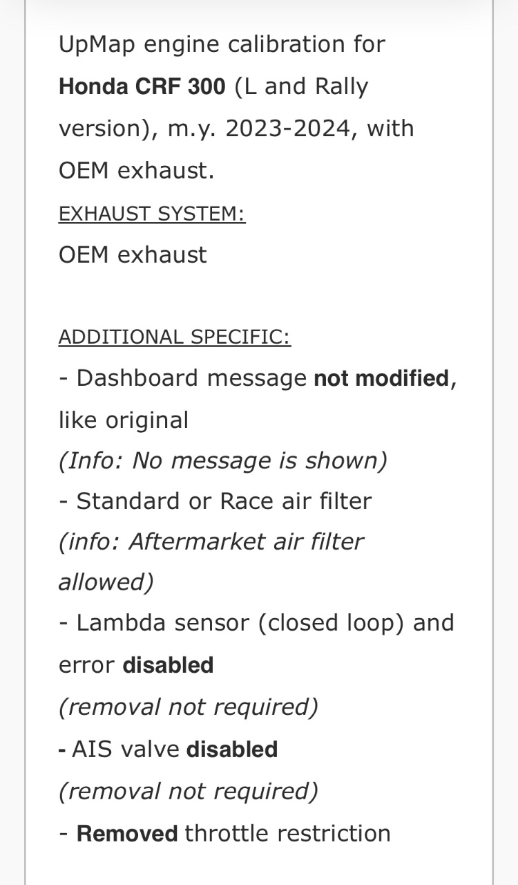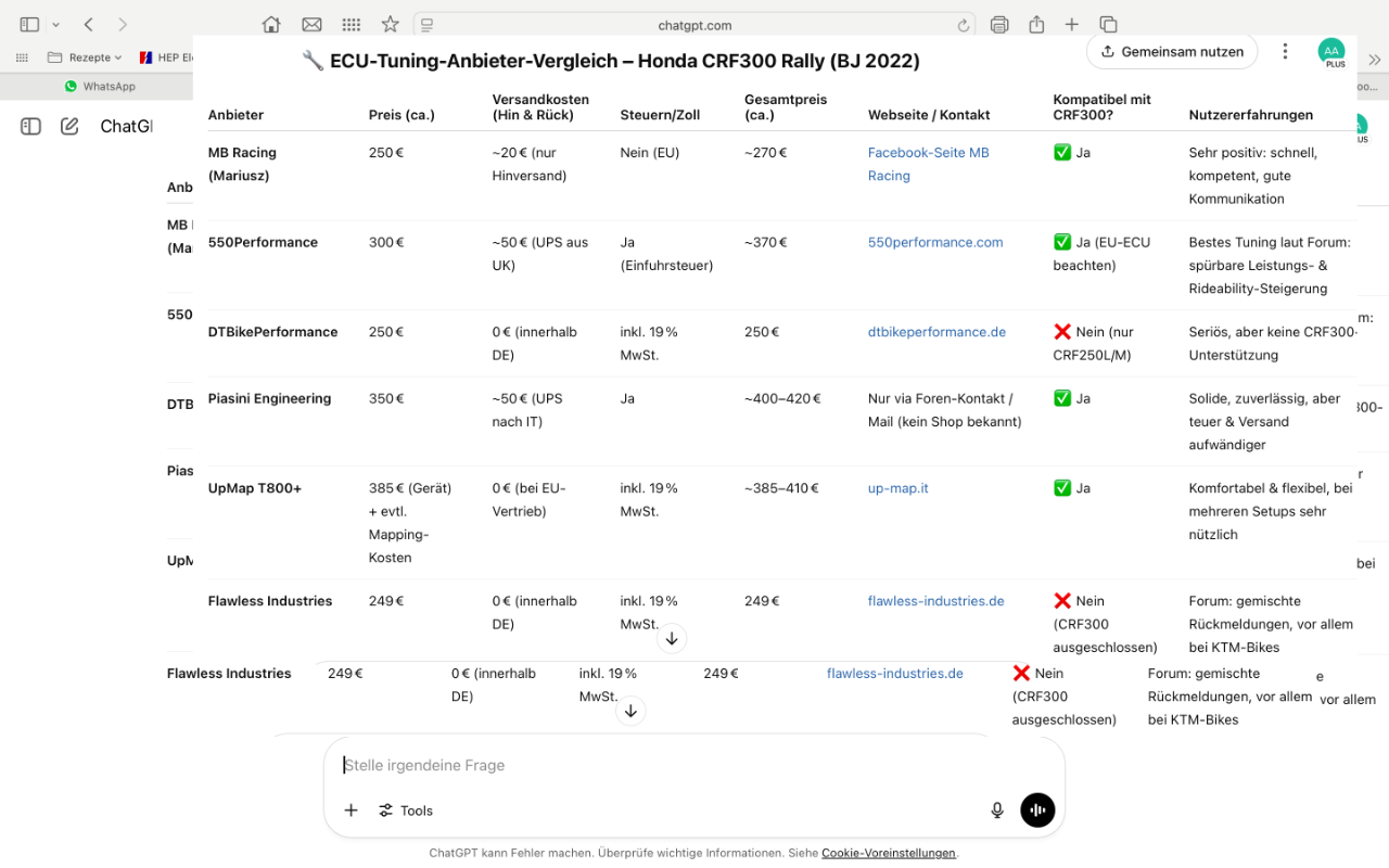 Hatte mit noch einem Tuner gesprochen, die Firma DTbikeperformance. Sehr netter Kontakt, meiner Meinung nach auch sehr versiert, allerdings hat er keine fertige Programmierung für die CRF300 vorliegen. Er würde etwas erstellen, benötigt dafür aber meine CRF für eine Woche. Die Anfahrt ist für mich aber 200km(=800km gesamt) und die damit verbundene Fahrzeit schreckt mich aktuell ab. Über Geld haben wir noch nicht gesprochen.