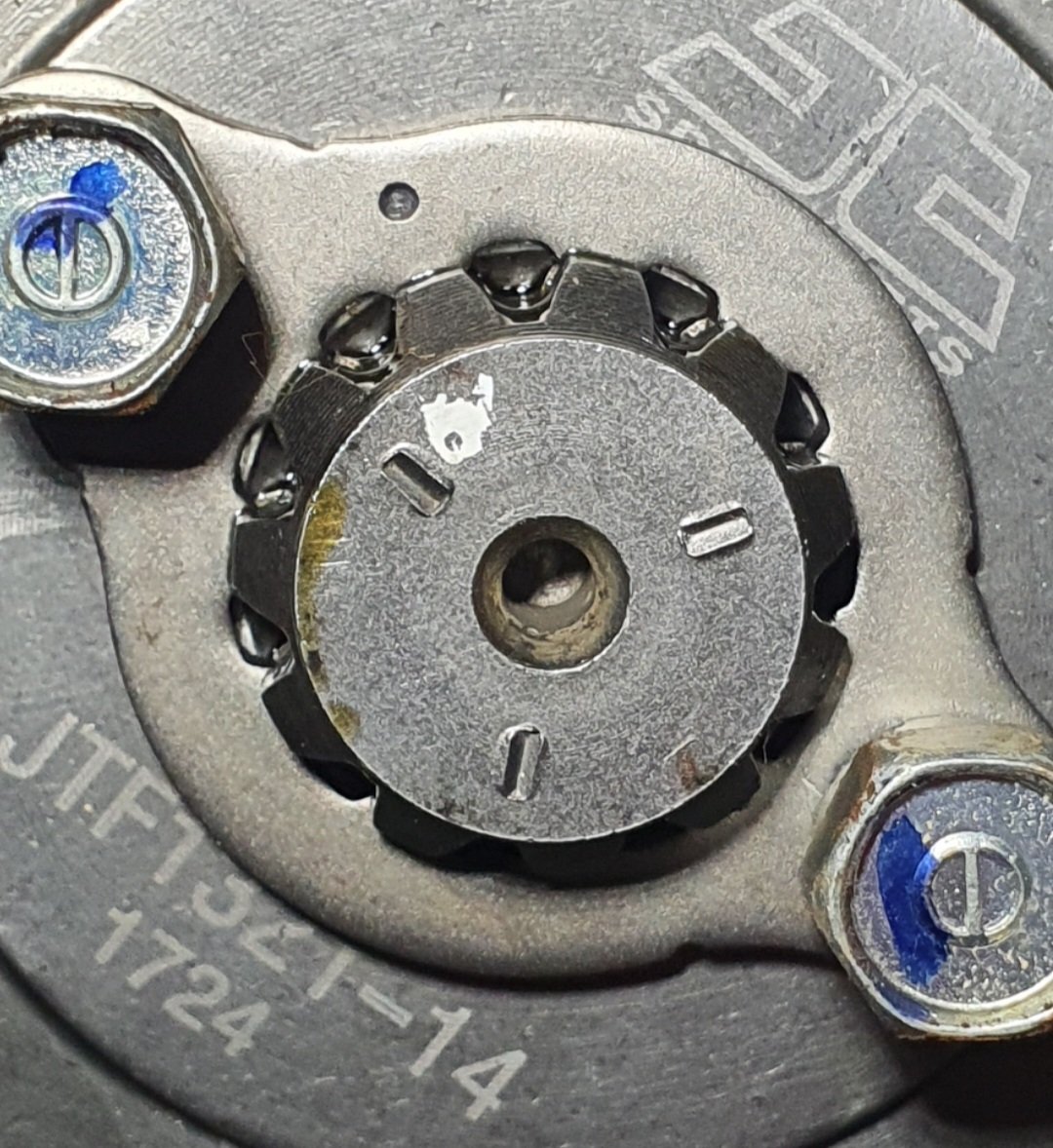 So hier mal Bilder von der Ausgangswelle und dem Kettenschleifer eines unserer Mopeds. Der Verschleiß ist bei beiden gleich, daher poste ich hier nur Fotos von einem der Mopeds. Beide Mopeds sind auf ca. 53000km. Die ersten 15000km mit dem original Ritzel ohne hinterlegtes Sicherungsblech, dann nur noch JT Ritzel mit Sicherungsblech dahinter. Super-Duper-Pasten Gedöns habe ich auch keines verwendet.