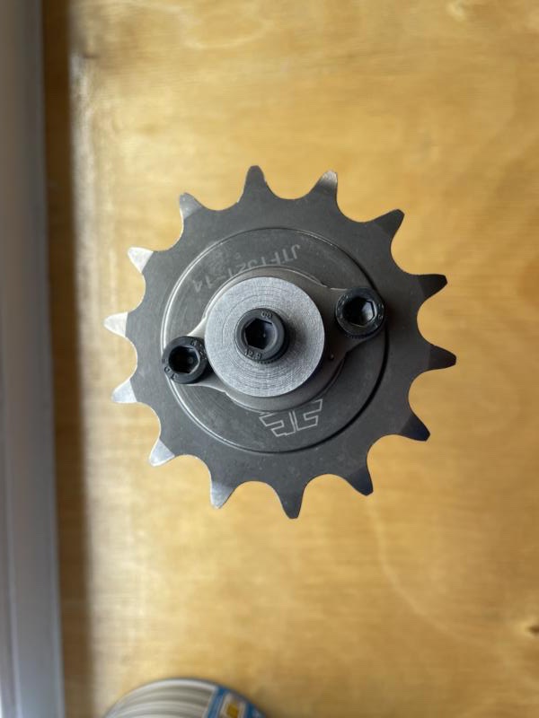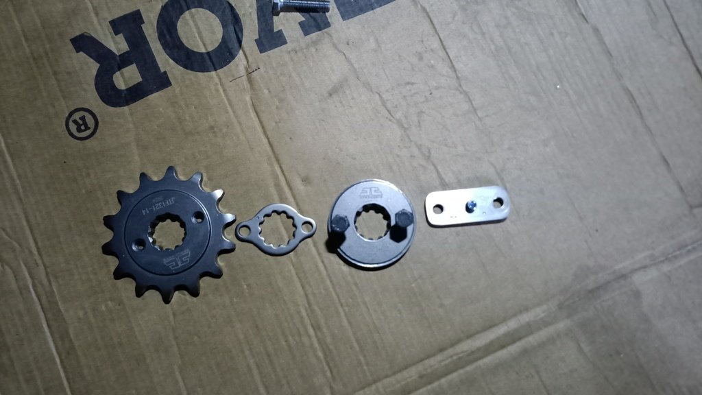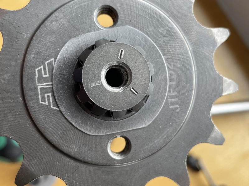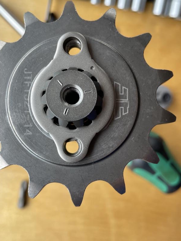 Das Ritzel wurde zum Schluss zusätzlich noch mit einer Madenschraube gegengezogen das erspart mir das eine Sicherungsblech hinter dem 14er Ritzel. Theoretisch könnte man das auch noch montieren, aber auf das habe ich vorerst verzichtet.