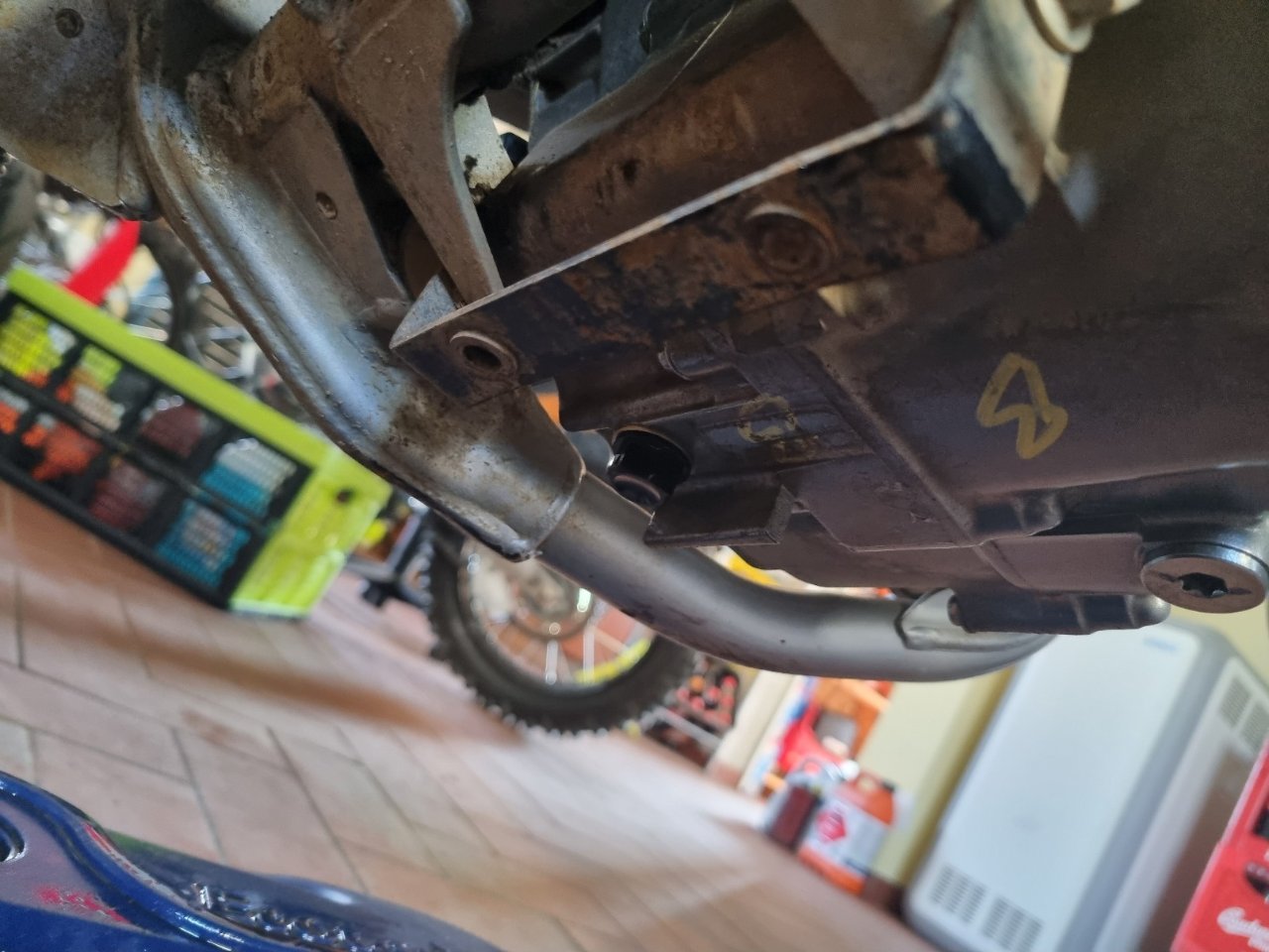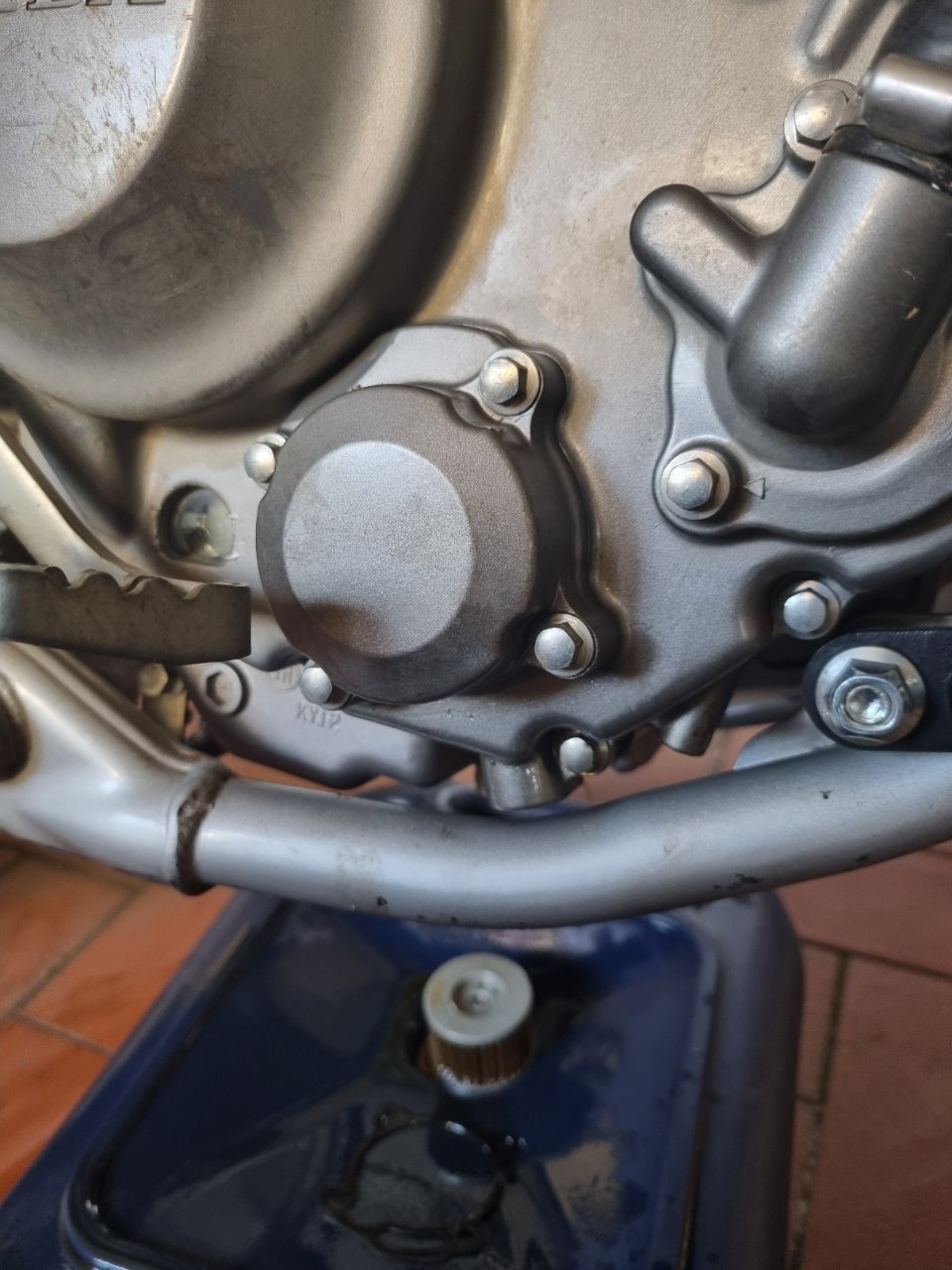 Dann geht es unten wieder an die Ablassschraube. Vorher das Motorrad nochmal vom Seitenständer heben, dann kommt noch ein bisschen mehr Öl raus und man hat gleich beim anziehen nicht so eine Sauerei. In alle Richtungen neigen und das meiste Öl raus kommen lassen. Nochmal die Dichtfläche abwischen und kontrollieren, dass ein neuer Dichtring auf der Ablassschraube ist. Oder eben die neue Schraube mit dem mitgelieferten neuen Dichtring montieren.