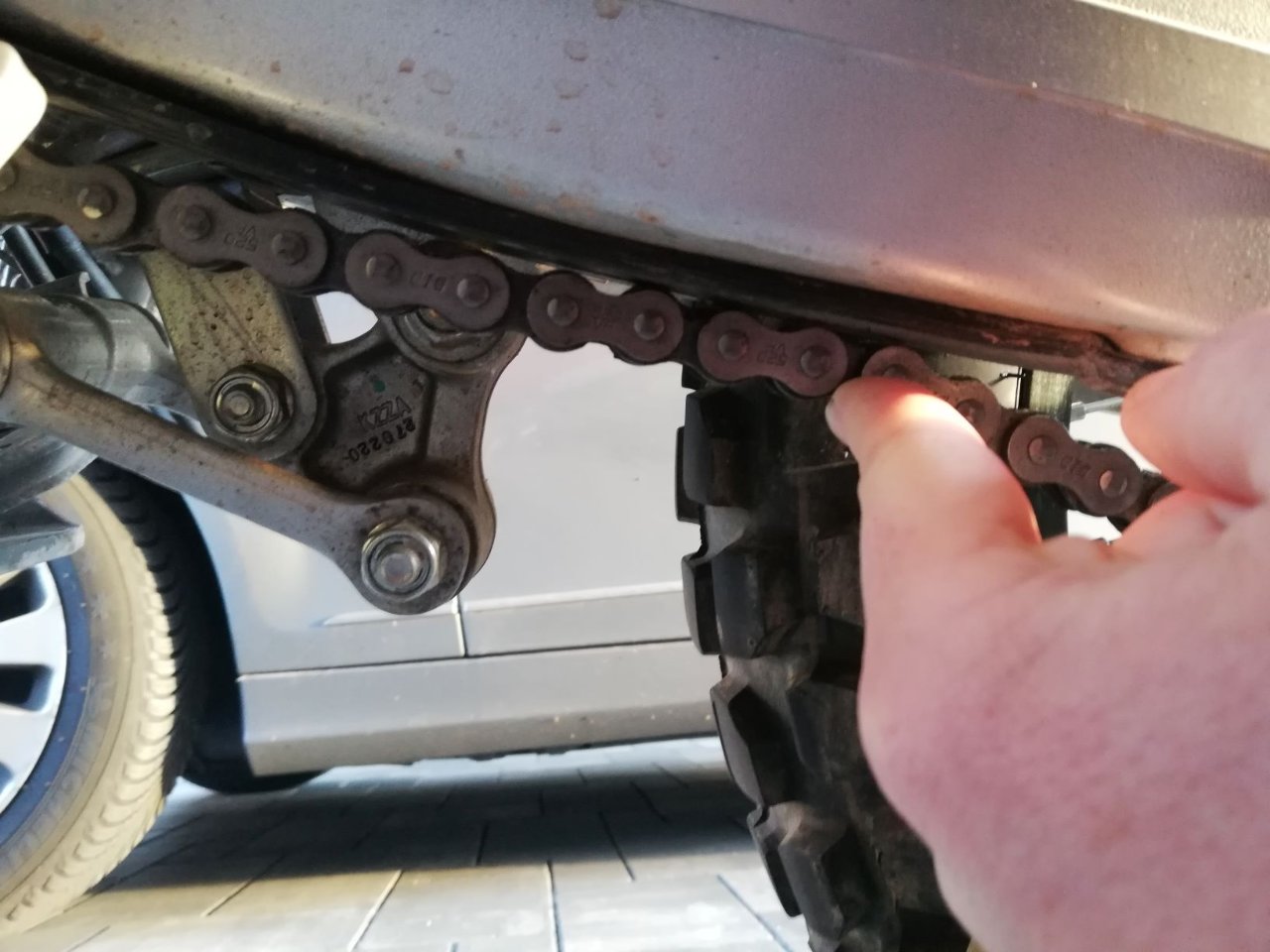 Am einfachsten geht es wenn du auf dem Motorrad sitzt. So kannst du die Kette oben an der Schwinge hochziehen. Ideal sind wenn du 2 Finger rein kriegst.