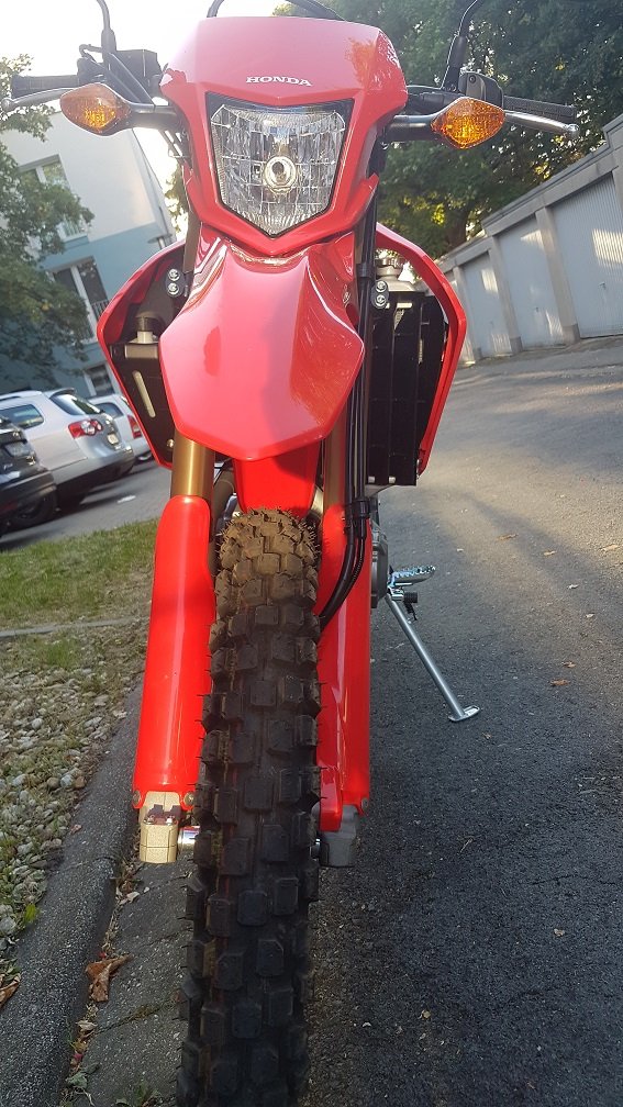 Lenkanschläge und Fußrasten sehen gut aus. Hier mal ein Foto wie das Motorrad nach dem Sturz aussah. Das ist jetzt nur so fix mit dem Handy fotografiert gewesen, aber ich denke man sieht, dass es so nicht ok ist.Micha hat geschrieben: ↑Dienstag 17. November 2020, 20:31Der dünnwandige Lenker der CRF verbiegt sich schnell und ist fast immer für ein "komisches" Lenkgefühl zuständig. Dass sich die Gabel verdreht, habe ich selten erlebt; wenn sie tatsächlich verdreht war, war sie zusätzlich auch verbogen (und musste das zwangsläufig ausgleichen, daher die Verdrehung). Und die Gabel der CRF ist schon sehr massiv. Wenn sich etwas verbiegen sollte, ist das aber schnell gefunden: Vorderrad und Schutzblech raus, beide Holme ausbauen und ein Stahllineal an Standrohr (das obere, dicke) und Tauchrohr (das untere, dünne) anlegen. Jeweils längs und viermal um 90° versetzt. Nicht täuschen lassen, bei der Upsidedown-Gabel ist auch das Tauchrohr das untere. Da ist Verzug schnell feststellbar und das ist professionell vermessen.