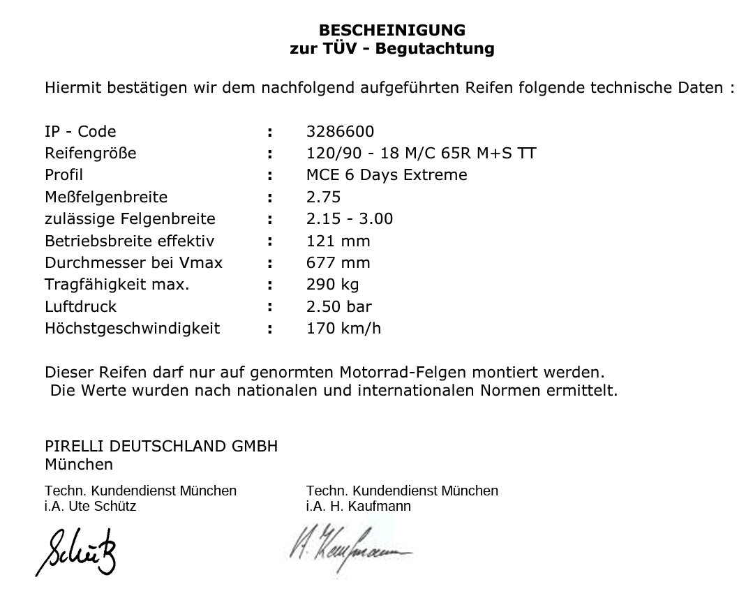 Wenn wir hier einen Reifen eintragen wollen, der nicht im CoC steht müssen wir zu einem Sachverständigen (das sind üblicherweise die, die auch alle 2 Jahre die gesetzlich vorgeschriebene Hauptuntersuchung machen) und von dem ein Gutachten bekommen. Dieser Sachverständige bestimmt, was genau er für die Eintragung sehen will. Das kann sehr unterschiedlich sein. Herstellerbescheinigungen über Tragfähigkeit etc wollen eigentlich alle sehen. Außerdem wollen sie den Reifen montiert sehen, um sicher zu stellen, dass der nirgendwo anstreift. Und oftmals ist dann noch ein Nachweis fällig, dass die geänderte Reifendimension den Vorlauf des Tachos nicht unzulässig verändert. Manche wollen dafür einfach selbst eine Runde mit dem Töff und einem angebauten Navi drehen. Andere wollen ein Gutachten von einem Tachodienst sehen. Manche wollen dann auch noch einen Nachweis sehen, dass das ABS (sofern vorhanden) weiter funktioniert. Dieser Nachweis kann beliebig schwierig werden.