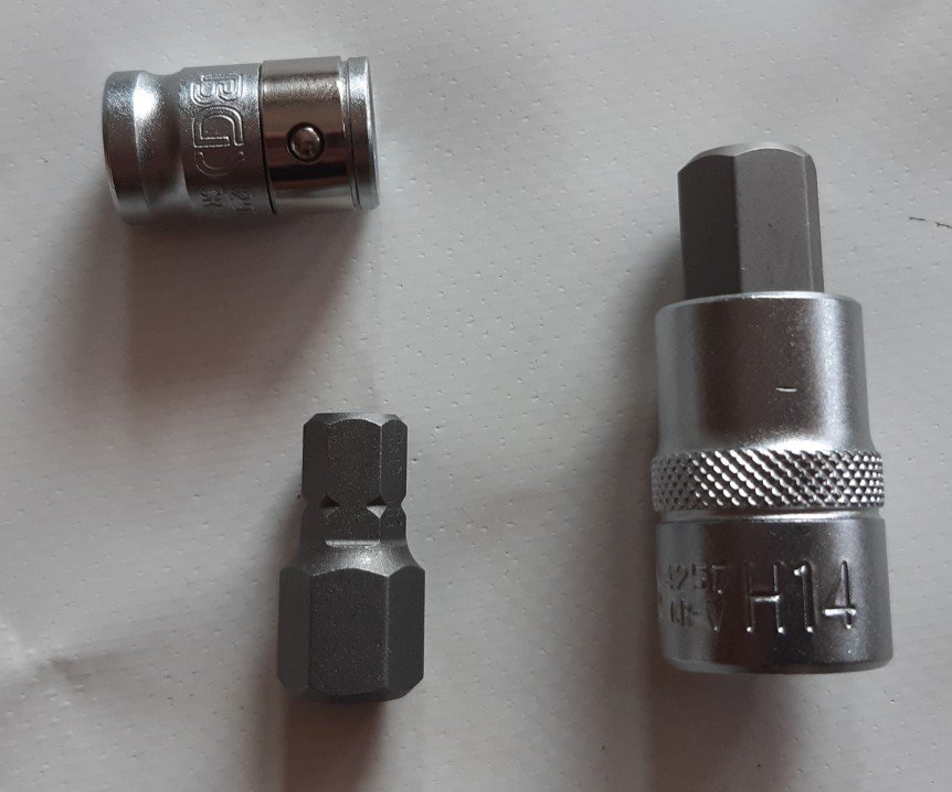Für die Vorderachse habe ich mir ganz einfach ne 14er Nuss (1/2") für daheim besorgt, für unterwegs nen 14er Inbus-Bit (für 3/8" =10mm Aufnahme) und den entsprechenden 3/8" Adapter.