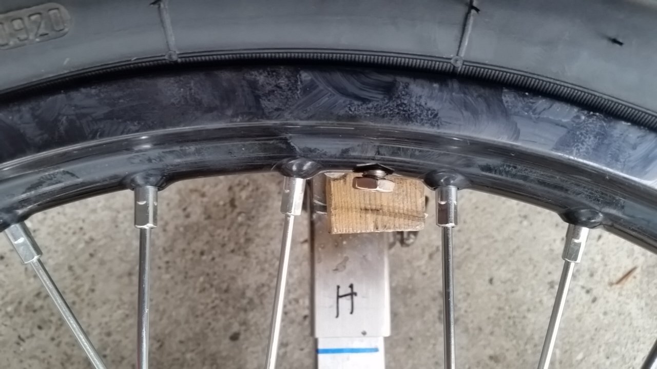 Ich habe mir vor einiger Zeit ein kleines Blech zugeschnitten, daß ich beim Reifenwechsel als dritte Hand verwende.