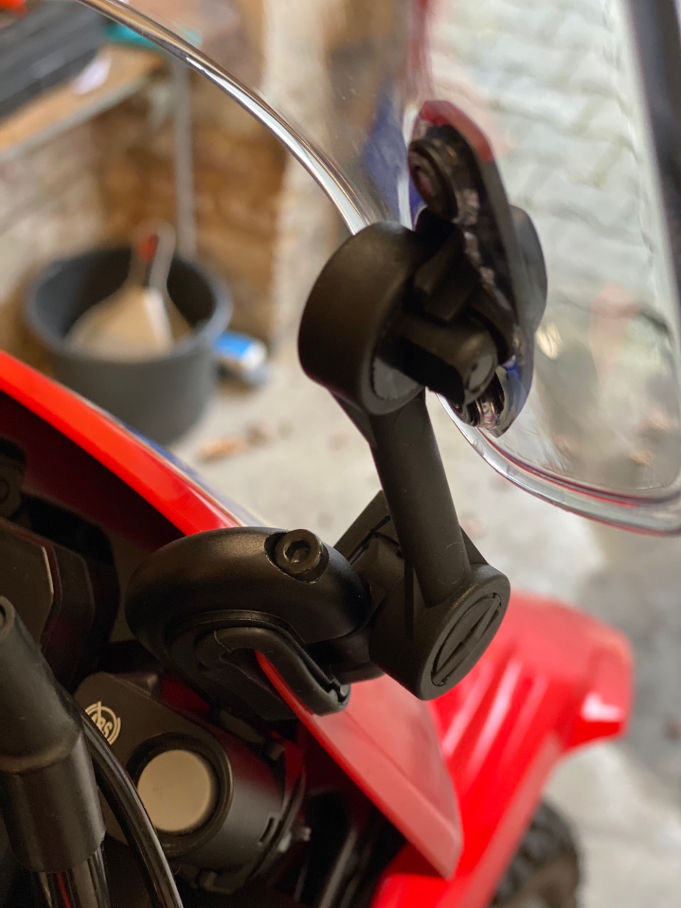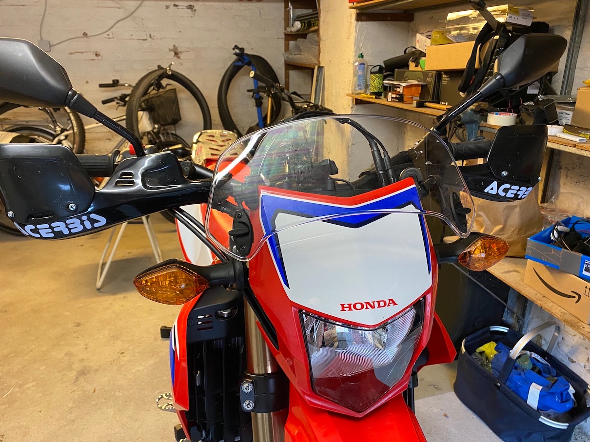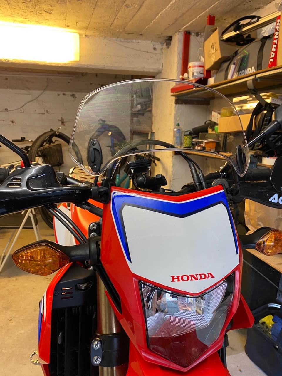 Manchmal muss man einfach nur warten. Da sitze ich da mit einem Kollegen und wir quatschen über Windschutz. Da sagt er das er noch einen unbenutzten MRA Aufsatzspoiler in der Garage habe. Hmmmm, vielleicht passt die ja an die CRF 300 L? Gerade mal getestet. Und siehe da...