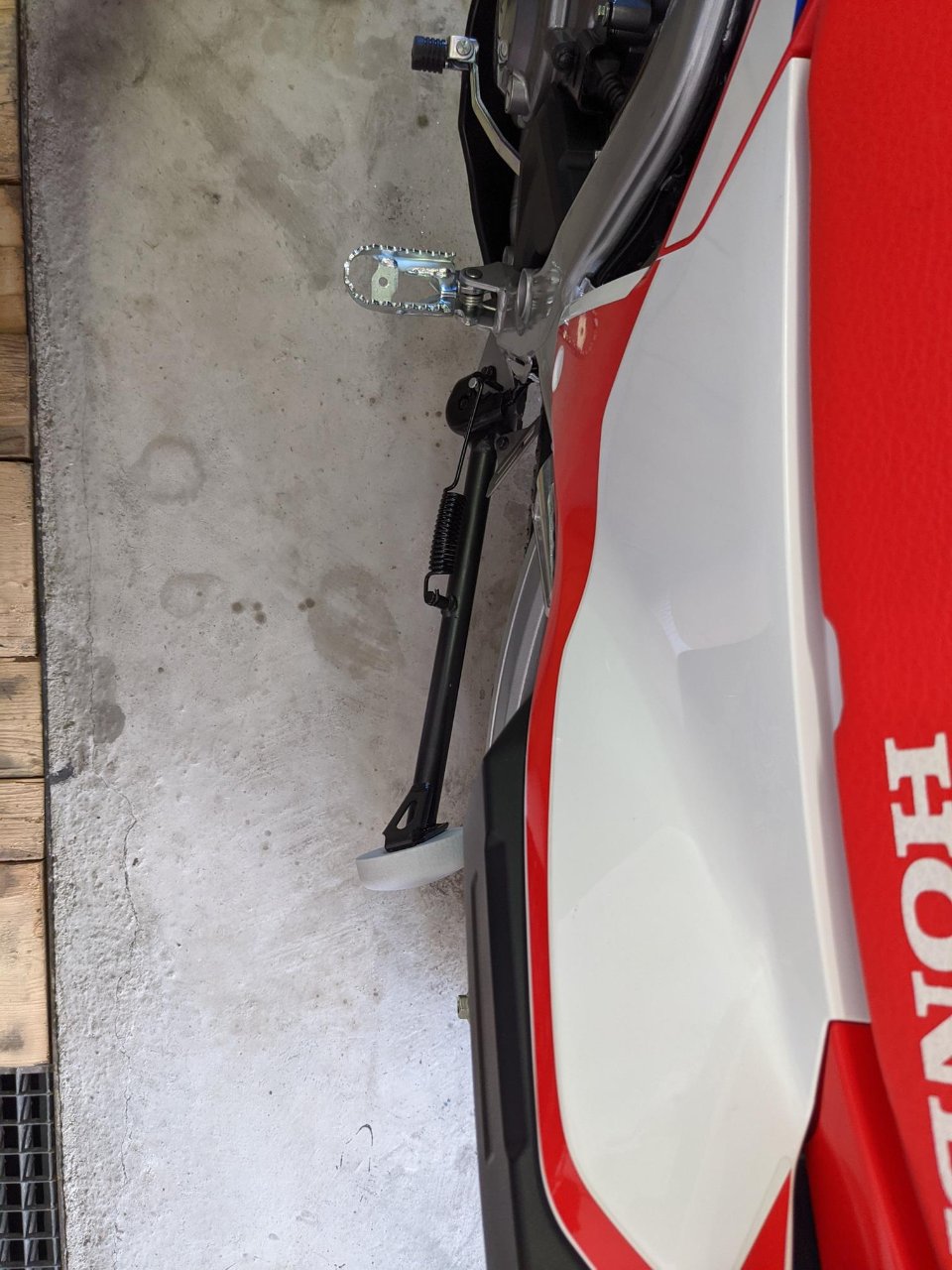 Wenn’s um das Parken in der Garage (oder dem eigenen Stammparkplatz geht), dann kann ich so etwas empfehlen. Wem das zu instabil ist (z.B. bei Wind), der schraubt das auf eine größere Platte. Die CRF sollte man bei den schmalen Reifen vorwärts und rückwärts einparken können.