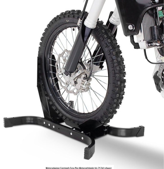 Die Radklemme vom PowerPlus habe ich im Transporter. Die hält auch das schmale Vorderrad, weil sie sich zuzieht. das Teil ist aber recht sperrig und für unterwegs nicht mitnehmbar. Ebenso die Motorradheber für die Schwinge oder unter dem Motorblock.
