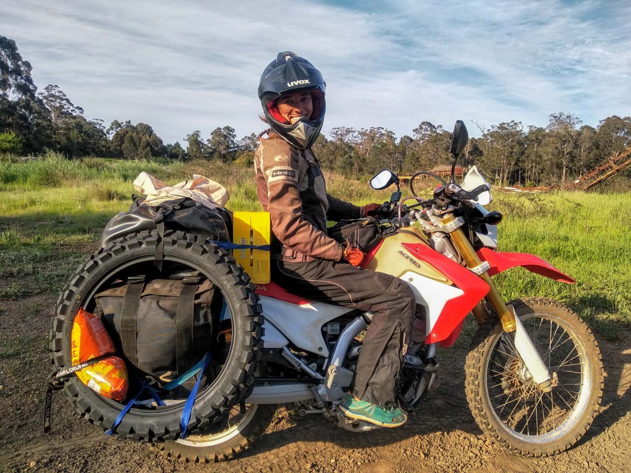 Zweimal 35L Adventure Spec, 1 x 89L Ortlieb Duffel, 1 x 6 Liter Wolfman Enduro Tank Bag, Karton Bier + Chips (gute Frau)