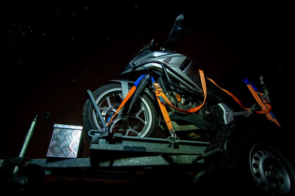 Ich hab oft 2 oder 3 Motorräder am Hänger, dann ist einfach der Platz nicht da um schön breit abzuspannen. Dann hilft nur anknallen.