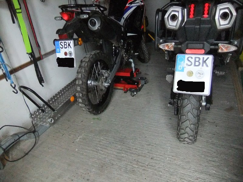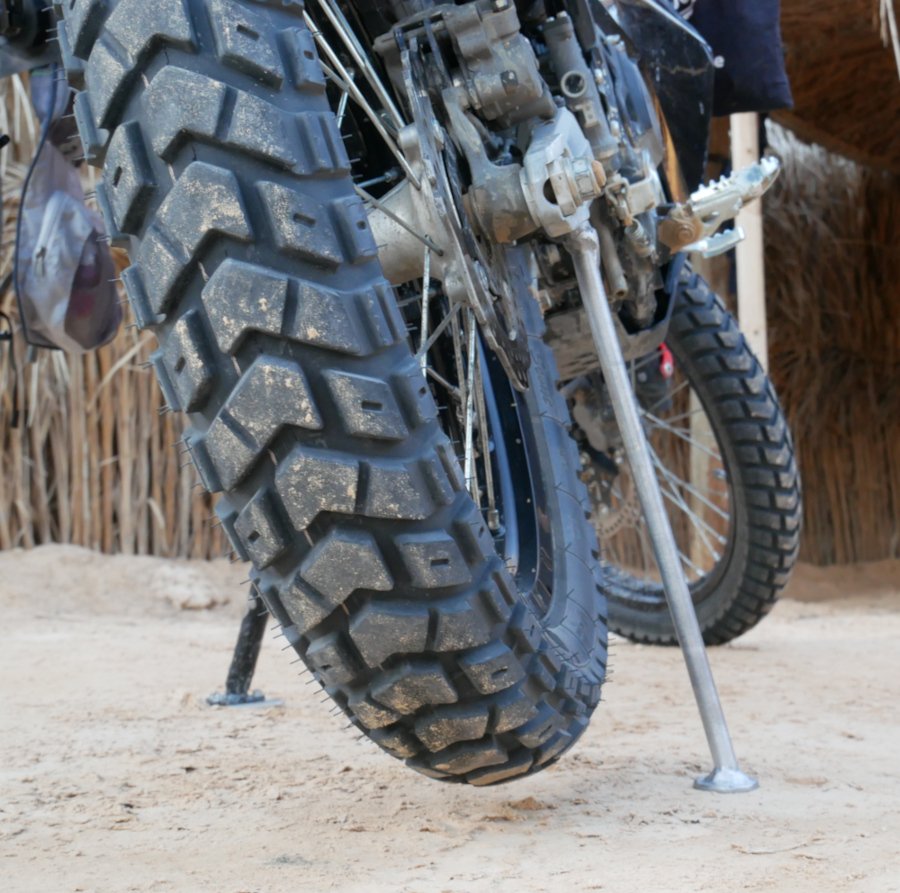 Für die CRF 250 Rally brauchte ich noch nen Stein unterm Seitenständer. Bei der CRF 300 Rally ist das Hinterrad auch ohne weitere Hilfe in der Luft.
