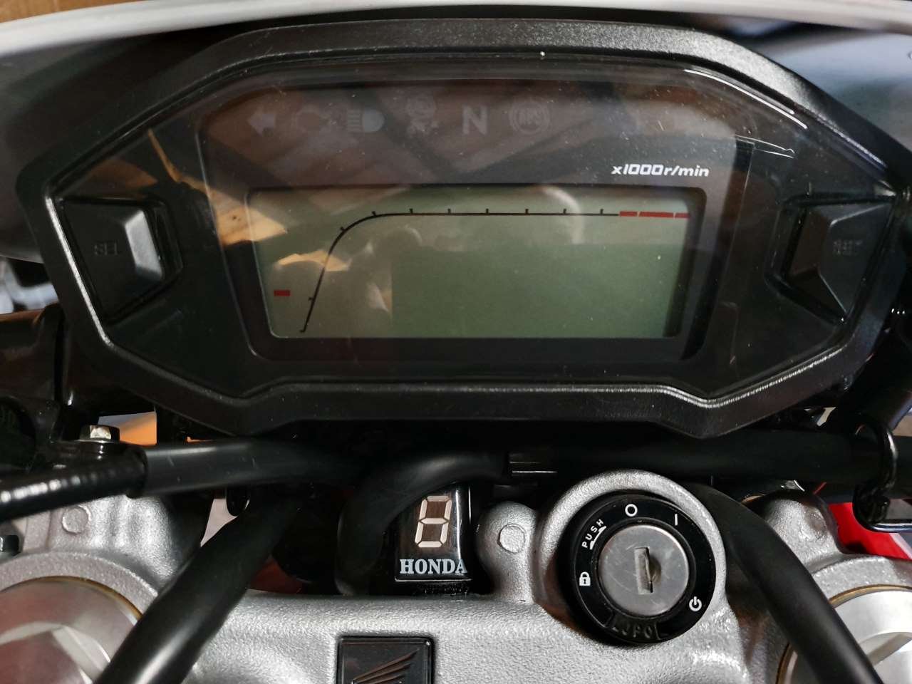 Die CRF hat keinen Gangsensor (nur Leerlaufschalter), das heißt, egal, wie toll das Display ist (und man kann von 10 bis 120 Euro ausgeben), es kann nur aus Drehzahl und Geschwindigkeit den Gang errechnen, wozu man es erst anlernen muss. Dazu stöpselt man das Display an, startet den Motor und schaltet, immer wenn das Display dies anzeigt, einen Gang hoch. 1, 2, 3, 4, 5, 6. Fertig. Ab jetzt "weiß" die Anzeige, in welchem Gang man ist. Allerdings geht das darum nicht bei gezogener Kupplung, weil die Korrelation Drehzahl-Geschwindigkeit dann fehlt. Auch dauert es nach dem Einkuppeln einen Sekundenbruchteil, bis der Gang erkannt wird. Ansonsten zeigt es zuverlässig an.