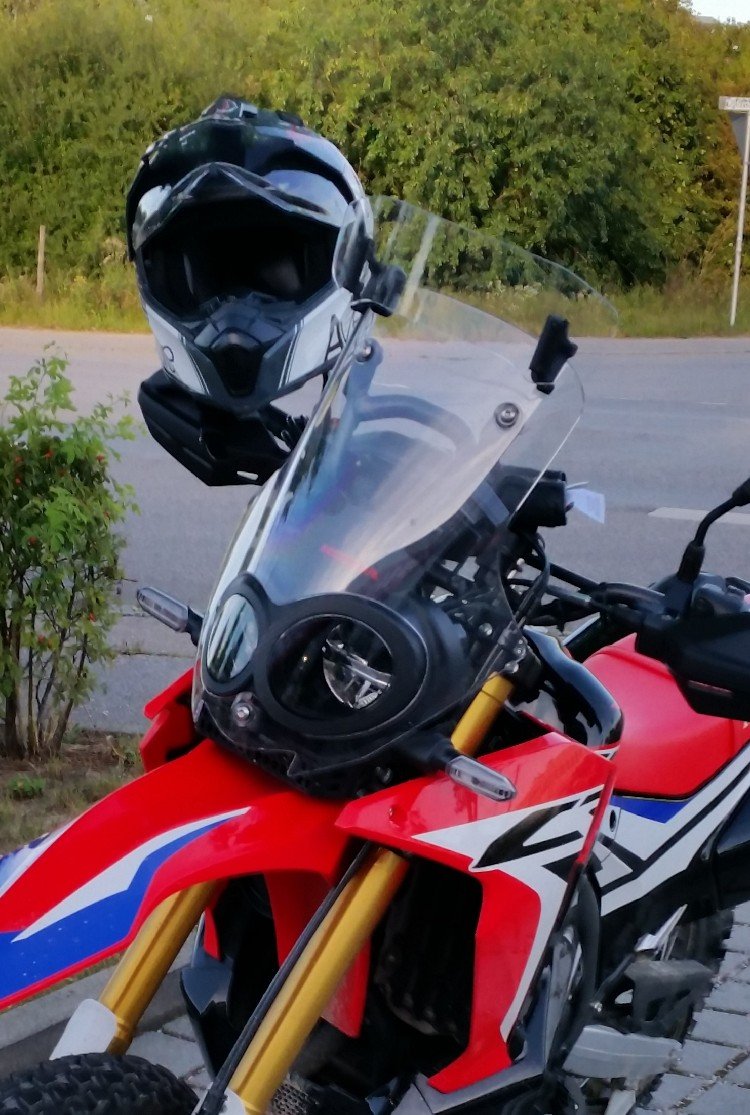 Dann bin ich auf die Landstraße und der erste Eindruck war sehr positiv. Bei 100 km/h geht der Fahrtwind fast komplett über der Helm. Dann noch einen Bogen über Schotterwege heim. Auch hier macht der Scheibenaufsatz einen soliden Eindruck und da wackelt selbst bei 60 km/h nix. D.h. die Klemmvorrichtung ist vertrauenserweckend und ich brauche erstmal keine Löcher bohren.