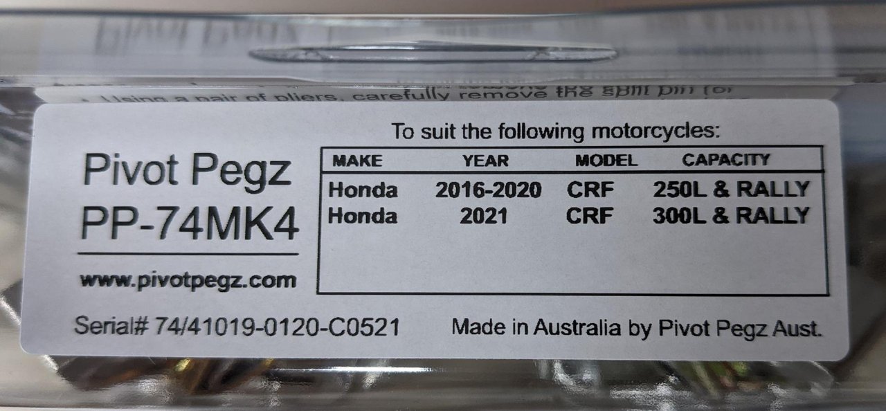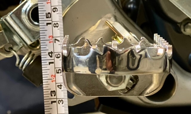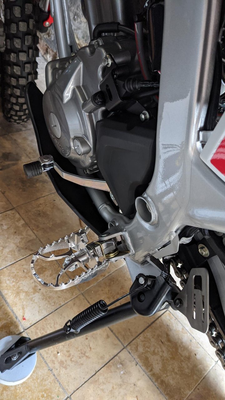 Ich habe die PivotPegz final in der tieferen (7mm) und weiter nach hinten (3mm) versetzten Position verbaut. Dazu muss man die Raste auseinandernehmen und die linke und rechte Achse tauschen. Allerdings habe ich festgestellt, dass die Rastenposition, gegenüber der CRF Serienrasten, selbst dann eher nur um ca. 0,8mm nach hinten versetzt ist und sich die Höhe gar nicht verändert hat. Allerdings fühlt es sich dennoch tatsächlich niedriger an, da die Raste sich ja nach vorne/hinten neigen kann. Ich werde den Fußbremshebel ggf. noch etwas nach unten versetzen.