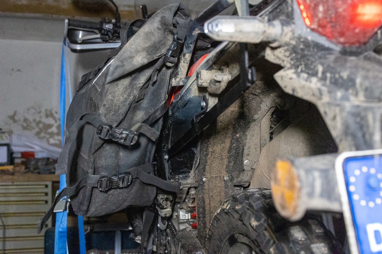 Leer hängt die Tasche jetzt etwas neben dem Eisen... Leer hängen die Enduristan Taschen eh etwas lummelig rum, hab mir auch einen Abgebrochen bis ich eine vernünftige Art gefunden hatte sie auf die CRF zu spannen. Voll sind sie aber kein bisschen im Weg.
