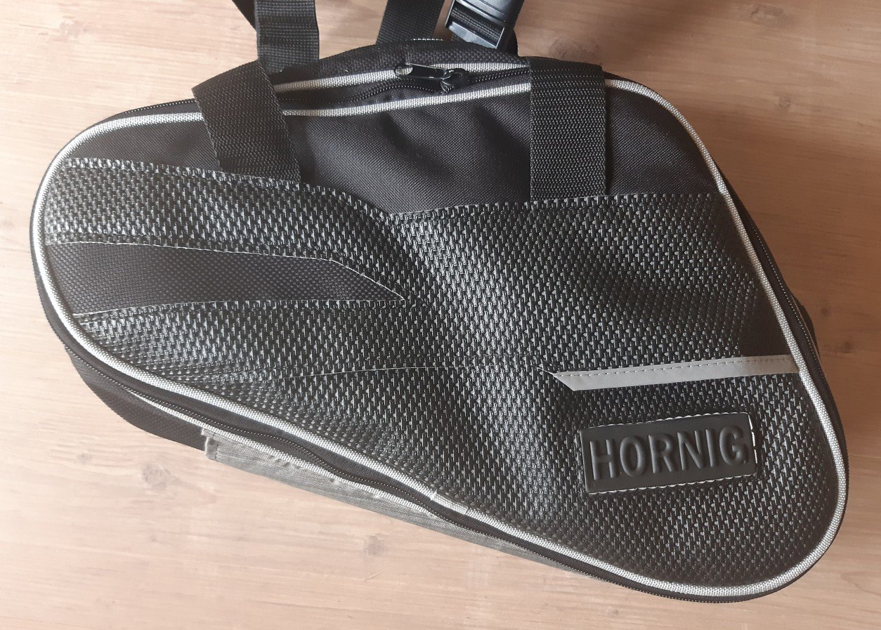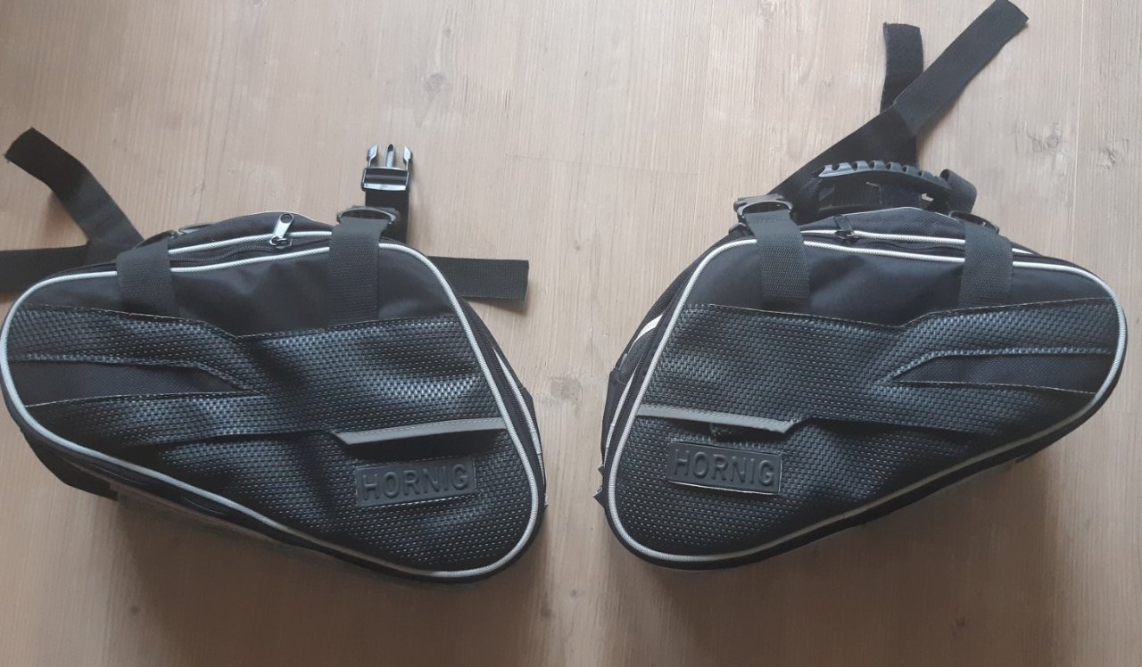 von Hornig so beschrieben: Gepäcktaschen bzw. Seitentaschen mit je 19 Litern Stauraum (links und rechts). Befestigung unter der Sitzbank mittels 2 verstellbarer Klettriemen und entsprechender Zurrgurte. Gummierte Tragegriffe für den Transport ohne Motorrad. Je eine Aussentasche, Hauptfächer teilweise speziell gummiert mit nahezu wasserdichten Reißverschlüssen.