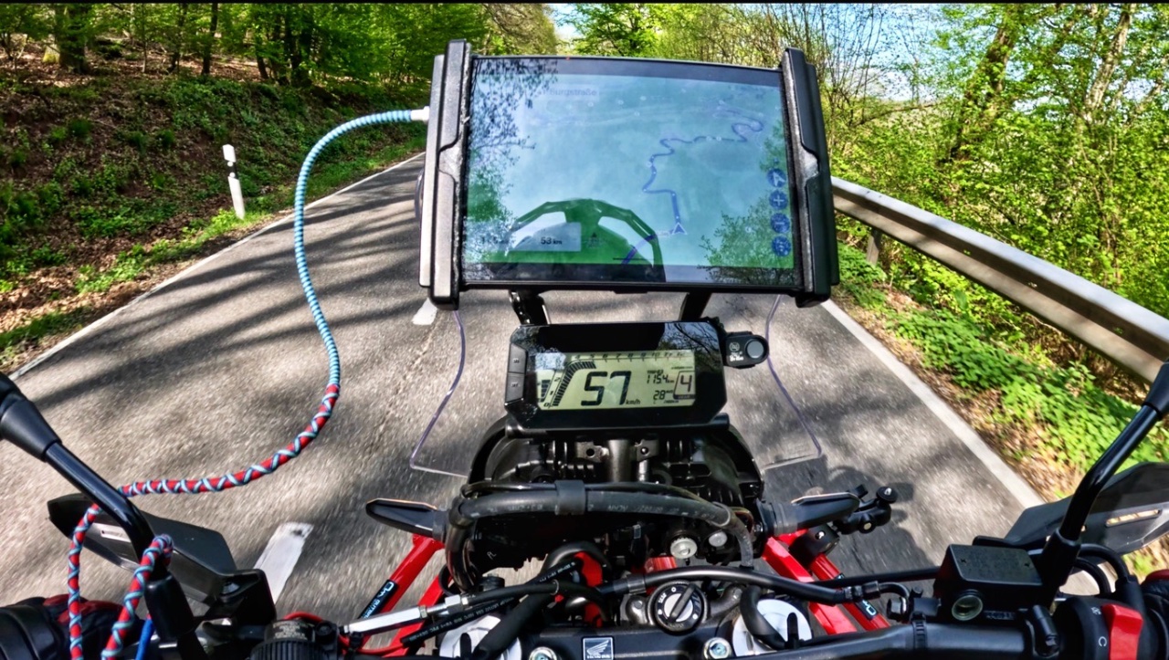 Es sieht etwas gewöhnungsbedürftig aus, funktioniert aber sehr gut. Akku reicht auch für längere Touren, und der große Bildschirm lenkt weniger ab als ein Handy, weil man die Route auch peripher wahrnehmen kann. Funktioniert auch perfekt mit meiner Lexin-Headset. Die Helligkeit war auch unproblematisch, auch bei Sonne wie hier konnte ich fast immer genug sehen. Kurviger, G-Maps und DMD2 funktionieren alle astrein darauf.