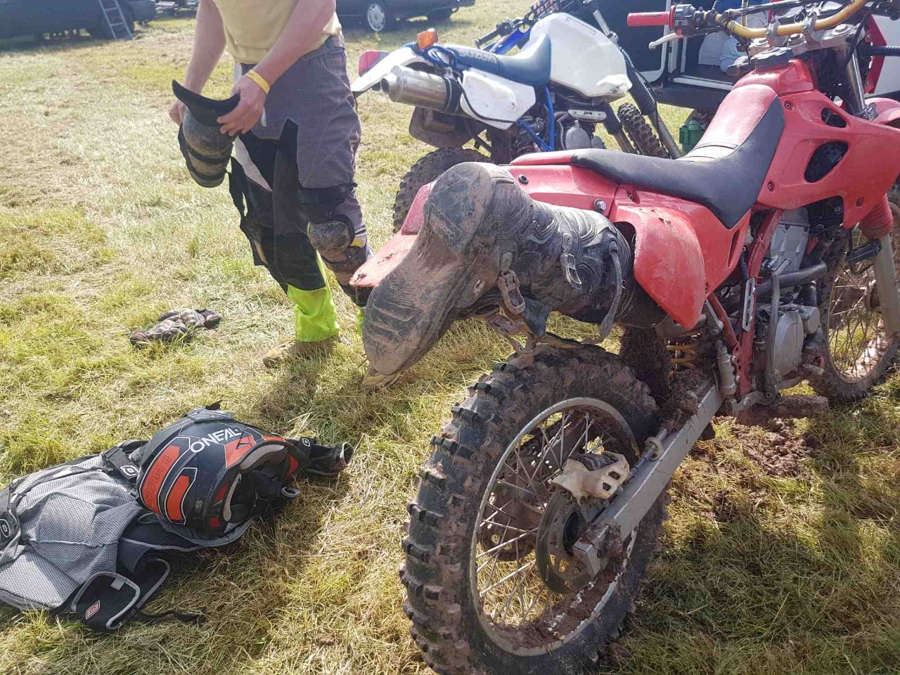 Die Endurostrecke war sehr rutschig, schon beim kleinsten Antippen der Bremse bist du gerutscht. Ich war sehr Happy mit der Kleinen CRF 300 L und den Michelin Tracker. Die meisten Dickschiffe hatten eher straßenorientierte Reifen drauf, maximal einen Ranger oder TKC 80 , aber das hat da nix gebracht.