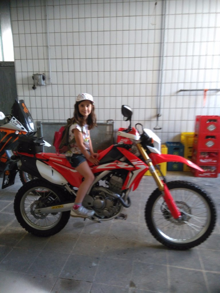 Ob nun eine hochbeinige Enduro besonders gut geeignet ist, bezweifele ich aber -wobei Deine Tochter ja immerhin relativ lange Beine hat.