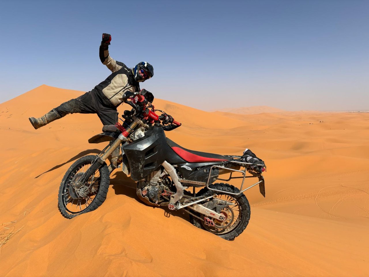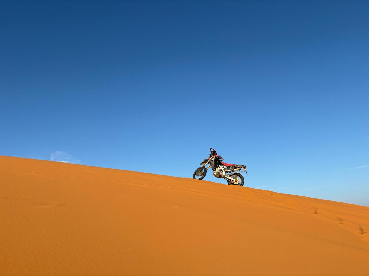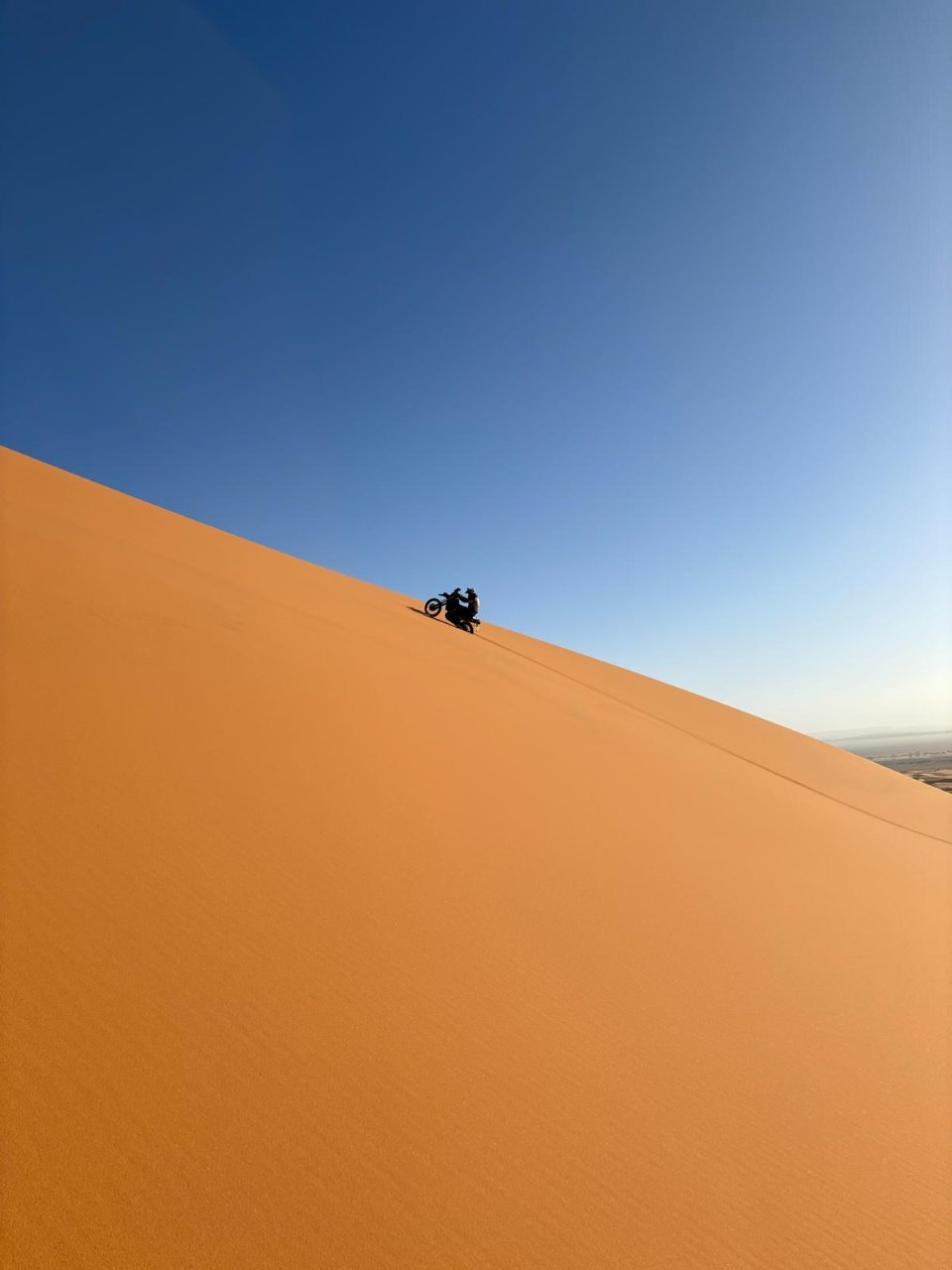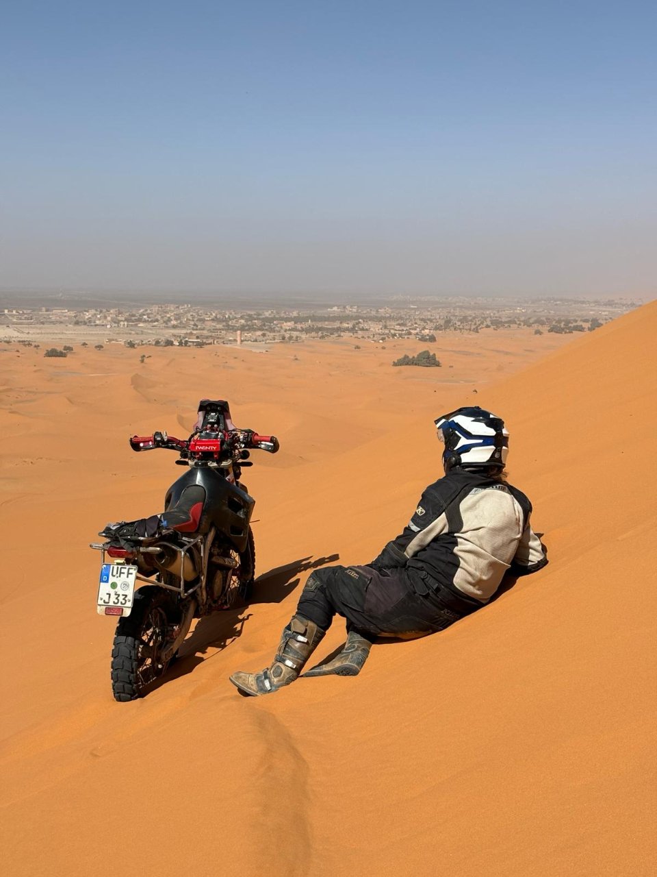 Bei Tan Tan haben wir den Sandro mit seiner T7 getroffen. Er ist erst zwei Tage mitgefahren und dann bin ich mit dem Sandro wieder Richtung Tan Tan und spàter Offroad nach Osten. Im Anti Atlas hat es uns dann erwischt, aber gegen 0400 hat der Regen aufgehört und es hat nur noch gestürmt. Am nächsten Tag sind wir dann auf der Straße knapp 600 km zurück nach Merzouga geballert, wo wir heute die 3. Nacht sind. Wir wollen noch ein paar Tage hier bleiben und das Dünenfahren weiter lernen. Das große Ziel wäre auf die ganz großen Dünen zu fahren. Heute haben wir das erste Mal richtig Gas geben.