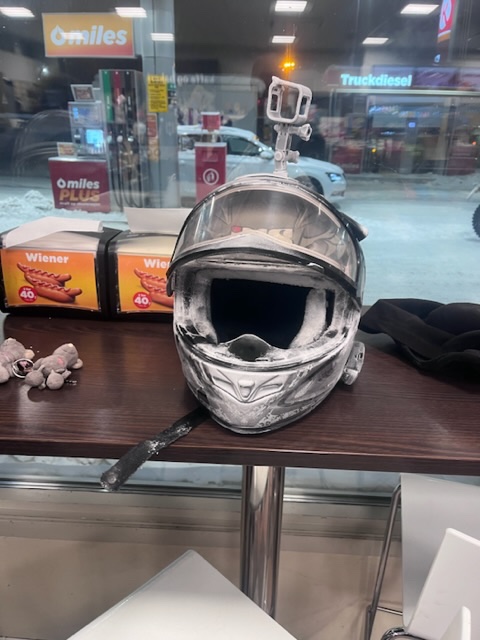 Auf den letzen 70km hatte ich dan mein Heizvisier entsorgt, weil sich die Folie gelösst hat und es daziwschen verreisste. Mit dem neuen Heizvisier fuhren wir bei minus 22grad die letzten 70 km Richtung hütte.