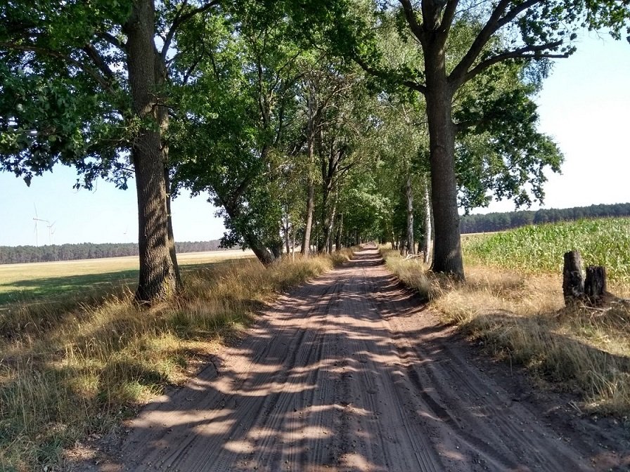 Nach dem Start habe ich dann entschieden für die ersten 40Km eine schnellere Strecke über eine Landstraße zu nehmen. Lief eigentlich auch ganz gut bis ich feststellen musste, dass ich beim checken der Strecke einen Wegpunkt neben die Track gesetzt hatte, super. Naja von der gesparten halben Stunde konnte ich gleich 15Min. wieder drauf schlagen. Ich liebe sowas, gerade los und schon ein „Navigationsfehler“. Aber irgendwas ist ja immer also rauf auf die Offroadroute und Richtung Oste ein bisschen fliegen lassen. Die ersten 3h ist es quasi Heimrennstrecke die fahre ich öfter. Flaches Land über Schotter, Wald und Wirtschaftswege Richtung Heide. An der A1 vorbei über eine alte Moorbahnstrecke rein ins Heidschnuckenparadies. Leider ist die Heide kein Endurfahrerparadies es gibt unzählige Naturschutzgebiete durch die man legal einfach nicht fahren kann. So macht die Heide eigentlich fast den gesamten Straßenanteil auf der Tour aus. Aber man ist dadurch auch zügig wieder raus und Richtung Lüneburg geht es dann schon wieder auf schönen Sand und Waldwegen vorwärts. Angemerkt sei noch das ich jeden Hügel hier genieße, bei uns in der Tiefebene ist die größte Erhebung ja der Deich, da kommt bei jeder kleinsten Erhebung schon richtig Freude auf. Je weiter man Richtung Elber fährt umso sandiger wird es schon und hatte ich schon erwähnt dass die Temperatur im Schatten 32°C beträgt. Wenn man dann so an der Elbe steht und auf die Fähre wartet möchte man den Kapitän eigentlich fragen ob er nur das Moped mitnimmt. Ich wäre liebend gerne rüber geschwommen. Aber bei 2,50 Euro sind nicht so viele Extrawünsche drin. Auf der anderen Seite angekommen ist man dann endlich da, im „Endurowunderland“. Am Anfang noch mit einer gewissen Struktur aber dann fährt man irgendwann ewig ohne auch nur ein Haus zusehen. Sandpisten die scheinbar offizielle Straßen sind und in Orte führen in denen es irgendwie aussieht als wäre die Zeit stehen geblieben. Wunderschöne Alleen mit Kopfsteinpflaster und Backsteinhäusern. Gutshäuser von „in der Sanierung“ bis Luxushotel. Dazu kommen die vielen großen und kleinen Badeseen links und rechts der Strecke. Wobei mir die Sandpisten auch hier und da zu schaffen machen. Meine Reifen (TW301/TW302) sind eigentlich dafür nicht mehr tauglich aber so lange man in Schwung bleibt geht es. Ich mache für die Tour zwei Tankstopps, nicht das die CRF säuft aber ich muss auch ordentlich Flüssigkeit nachschütten. In der Nähe von Ludwigslust habe ich dann noch eine geführte Tour getroffen und kurz „Hallo“ gesagt, zumal 2 Rallys mitgefahren sind. Die Jung und Mädels werden Abends sicher gut aussehen, hinten in der Gruppe zufahren ist jetzt nicht ganz staubfrei.