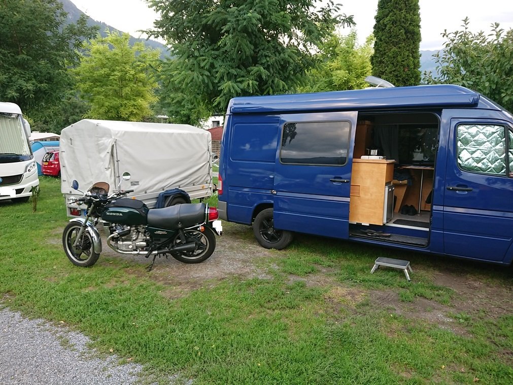 Im Sommer habe ich mir noch einen Brenderup Kofferanhänger Einachser gebremst mit 1,6t zgM gebraucht gekauft, von einem Crossfahrer. Da passen bis zu drei Hardenduros/Crosser rein. Der Vorbesitzer hat noch Be- und Entlüftung eingebaut und an den Seitenwänden 2 herunterklappbare "Betten", sodass man im Sommer sogar da drin pennen könnte. Hab ich aber nicht gebraucht, hab ja ein WoMo.