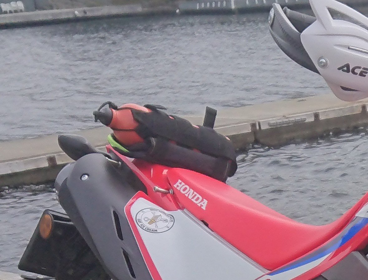 1,5 l Benzinflasche aus dem HD-Custombereich... 30,-Teuronen. Immer dabei, passt auf's Heck. Ach ja, Flaschenhalter von Lowbrow Customs ist dabei. Durch Klettverschluss fast überall zu befestigen.