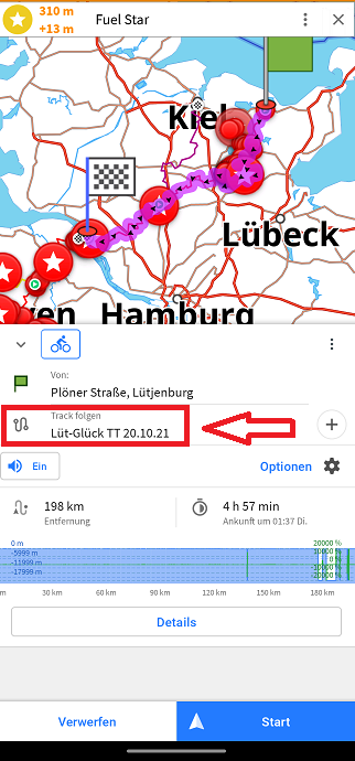 Wird noch eine alte Strecke angezeigt auf „verwerfen“ drücken.