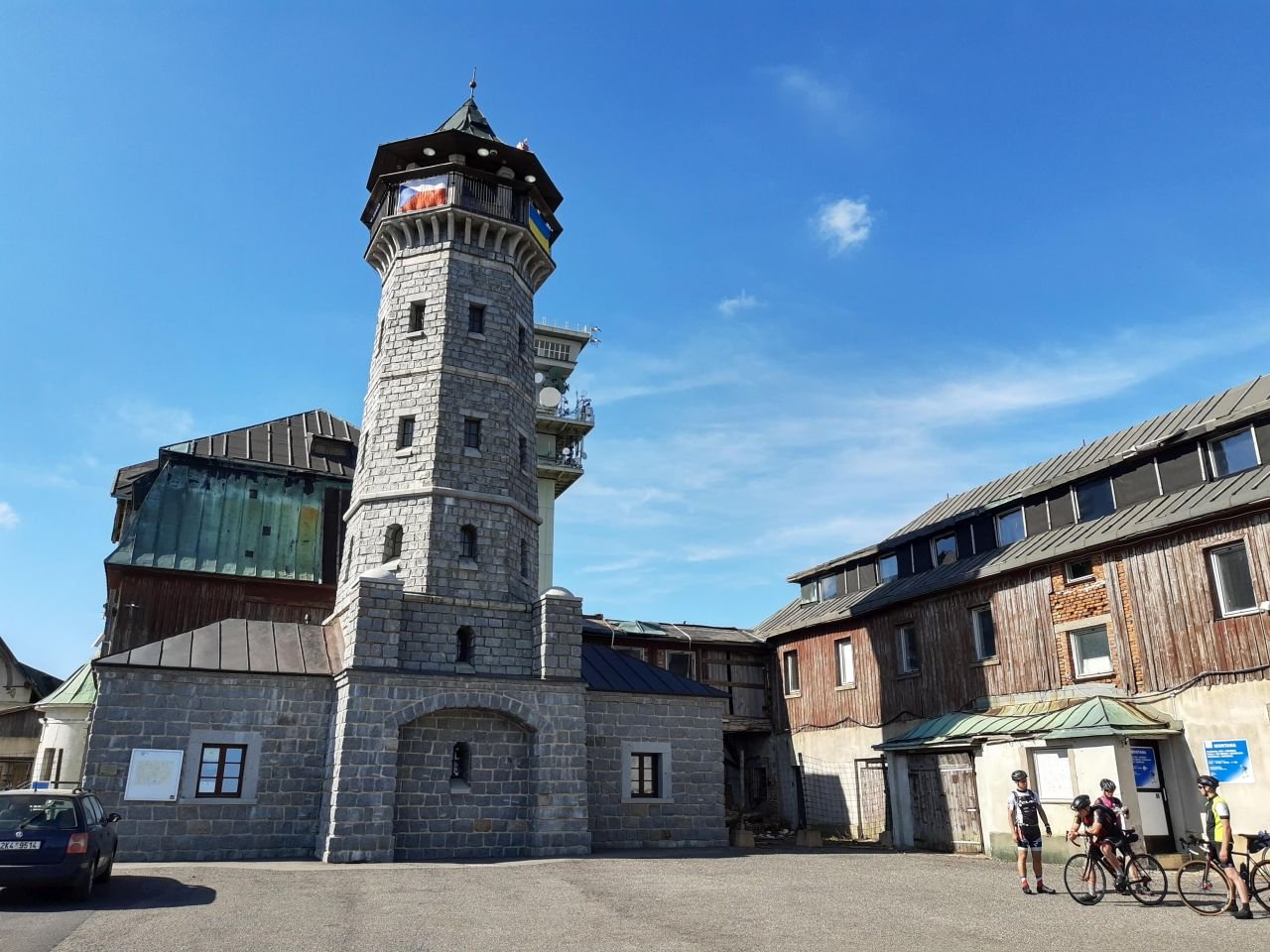 Neben der Schranke hängt ein neueres Schild, auf tschechisch, aber Google Lens übersetzt perfekt. Und gerade als ich mich frage wen ich mit der angeschriebenen Telefonnummer erreiche, taucht ein Geländewagen auf.