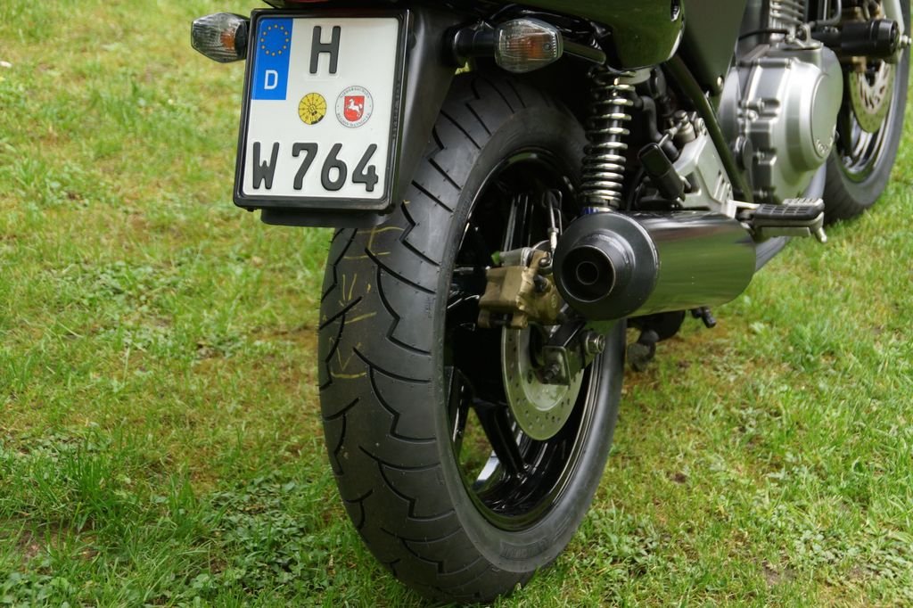 Die Abnahme konnte nur Frank Bialkowski vom TÜV Hämelerwald vornehmen, weil er einer von zwei befugten Sachverständigen in ganz Niedersachsen ist. Er hat dann einen Fahrversuch bei Höchstgeschwindigkeit auf der A2 unternommen und schlussendlich alles eingetragen, aber eben mit einer Bindung an den damals montierten Michelin Pilot Activ. Die Felge der Sevenfifty ist ja samt des montierten 150/70-17 Bestandteil eines deutlich schwereren und leistungsstärkeren Modells und ist dort als Bauteil zugelassen, es ging nur um die Art der Adaptierung an die CB500. Unter anderem eben wegen der oben genannten "Flucht" der Teile, aber auch wegen der nötigen Abstände zwischen Reifen und anderen Teilen. Auch bei einer Nennbreite von 150 mm sind schon mal Reifen 145 oder 155 mm breit, da kommt es also auch auf das Reifenmodell an. Letztlich hat die Abnahme samt Eintragung beim Straßenverkehrsamt 130 Euro gekostet. Das "lohnt" sowieso alles kaum, an dieser CB ging es aber inklusive vieler weiterer Umbauten an Fahrwerk, Bremsanlage, Auspuff und Optik einfach mal darum, dass ich zeigen wollte, was man daraus machen kann. Allein das Felgenprojekt hat mit Pulvern und neuen Reifen über 800 Euro verschlungen :oops: