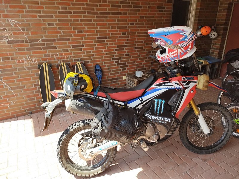 Klar, an ein Geländemoped dürfen nur Softtaschen ran, einmal wegen der Verletzungsgefahr bei Koffern und natürlich, weil Koffer halt beim Sturz sehr leicht kaputt gehen. Jetzt gibts aber nochmal eine Grundsatzentscheidung, baut man sich Kofferträger ans Moped, oder wie Du es gemacht hast, nur die Taschen alleine mit dem tollen Trägergurt.