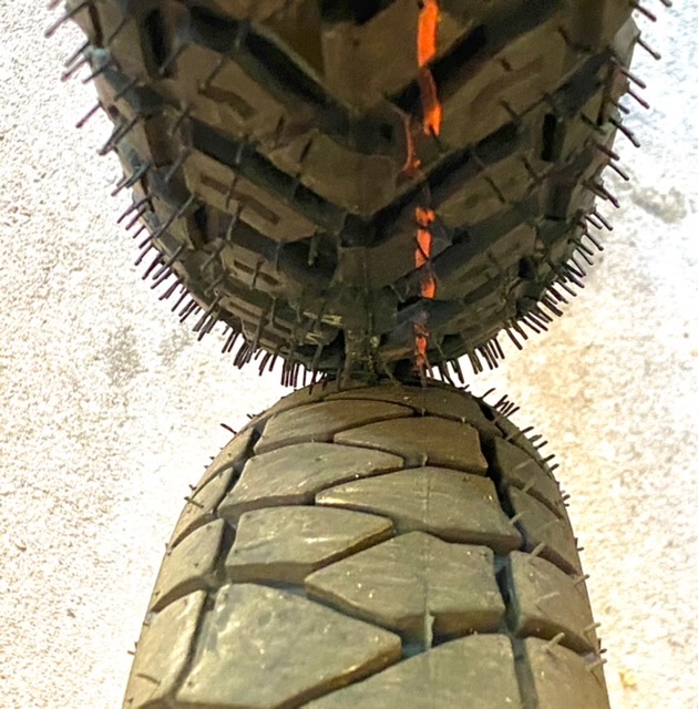 Reifengrößen sind Schall und Rauch. Der Mefo Explorer 120/80-18 ist (gemessen) eher ein 120/90-18 und der 80/100-21 Vorderreifen ist eher ein 90/95–21 - ja ich weiß, 95er gibt’s nicht, aber nach Messung wäre er das (so ungefähr).