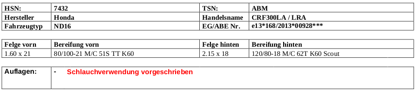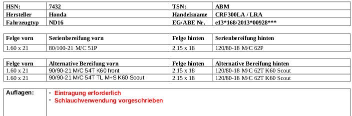 Übrigens ist eine Eintragung von 90/90-21 bei der CRF300L nicht einfach möglich. Selbst wenn es eine Reifenfreigabe des Herstellers gäbe. Schau mal in die anderen Diskussionen hier.