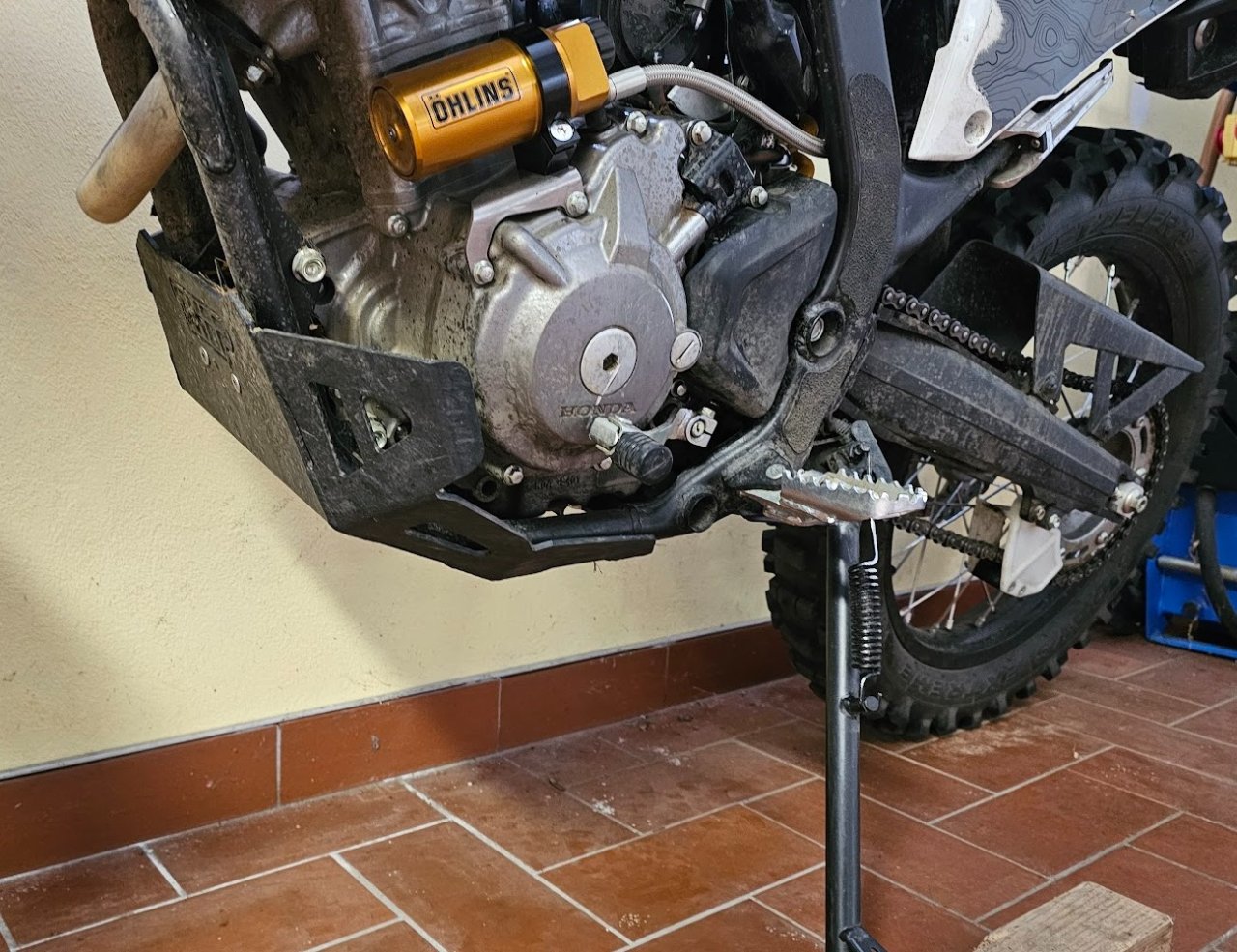 Habe andere aber ähnlich. Damit reibt sich der Rahmen nicht mehr ab. Seitenteil und Sticker haben trotzdem Kampfspuren von den Enduro-Stiefeln. Die sind halt hartes Plastik und haben kein Erbarmen Von einem Sturzbügel würde ich dir eher abraten. Einen Unterfahrschutz brauchst du sowieso, da der Rahmen ja da unten komplett ungeschützt verläuft. Die CRF baut aber unten so schmal, dass sie eh nicht auf den Motor fällt, wenn du auf ebenem Grund hinfällst. Bei unebenem Untergrund hilft dann auch so ein Sturzbügel, wie ich ihn an der 250L habe, nicht Und ein noch massiverer, der wirklich um den Motor rum geht, wäre (falls es überhaupt einen gibt - ich kenne keinen) so schwer, dass du aus dem leichten Bike dann doch wieder ein Dickes Monster gemacht hättest. Tatsächlich bin ich auch schon mal mit dem Sturzbügel an einem Baumstumpf hängen geblieben. Ob ich ohne auch gestürzt wäre weiß ich freilich nicht. Der kann aber auch stören