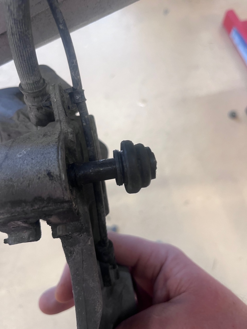 Damit ich den Führungsbolzen im Bremsattel bewegen konnte, habe ich die Mutter wieder auf das Gewinde aufgeschraubt und dutzende Male festgezogen und wieder gelöst, bis sich letztendlich der Führungsbolzen im Bremssattel drehen ließ und langsam heraus kam.