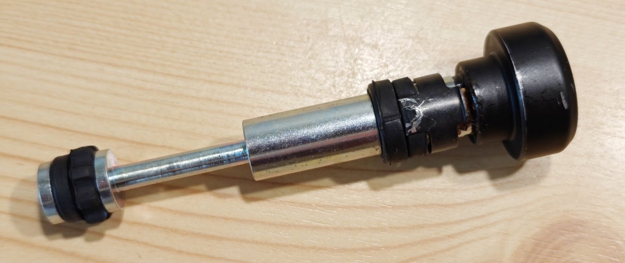 Zum einfacheren Herausbekommen muss man an die Löcher in den Lenkerohren kommen, und die Widerhaken durch die Löcher hindurch flachhauen, z.B. mit einem kleinen blinden Bit und einem kleinen Hammer. Auf der linken Seite muss man dazu den Griffgummi nach hinten rollen und das ist EXTREM schwer. Ich habe es endlich hinbekommen, indem ich es mit einem Kabelbinder vom Zurückrollen behindert habe. Dann bekommt man die ganze Konstruktion wie bei Städi viel einfacher mit Gabelschlüssel und Hammer raus. Zwischendurch etwas drehen hilft auch.