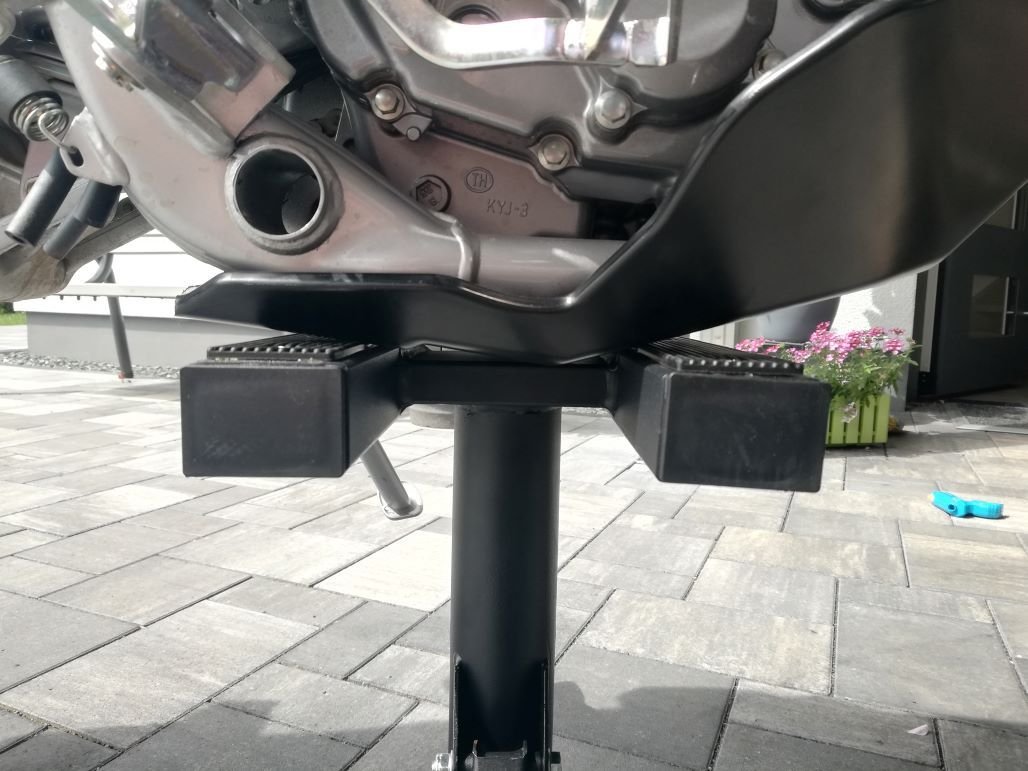 Den habe ich auch und darauf steht sie richtig gut; aufbocken geht auch mit dem Motorschutz. Ich habe noch eine Extra-Matte zwischengelegt, um keine Schrammen zu hinterlassen.