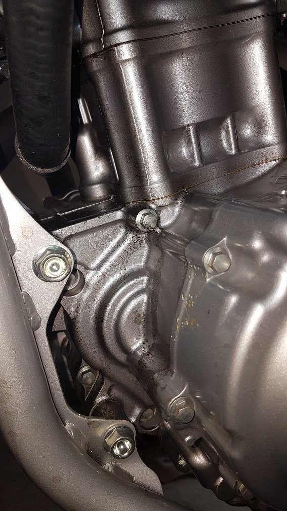 Ich habe das Motorrad heute zur Inspektion gebracht. Der Werkstattleiter tippt eher auf die Schraube oben links am Zylinderkopfdeckel. Ich glaube die Schraube bzw. das Loch in dem sie steckt wird genutzt,um den Kipphebel zu montieren.