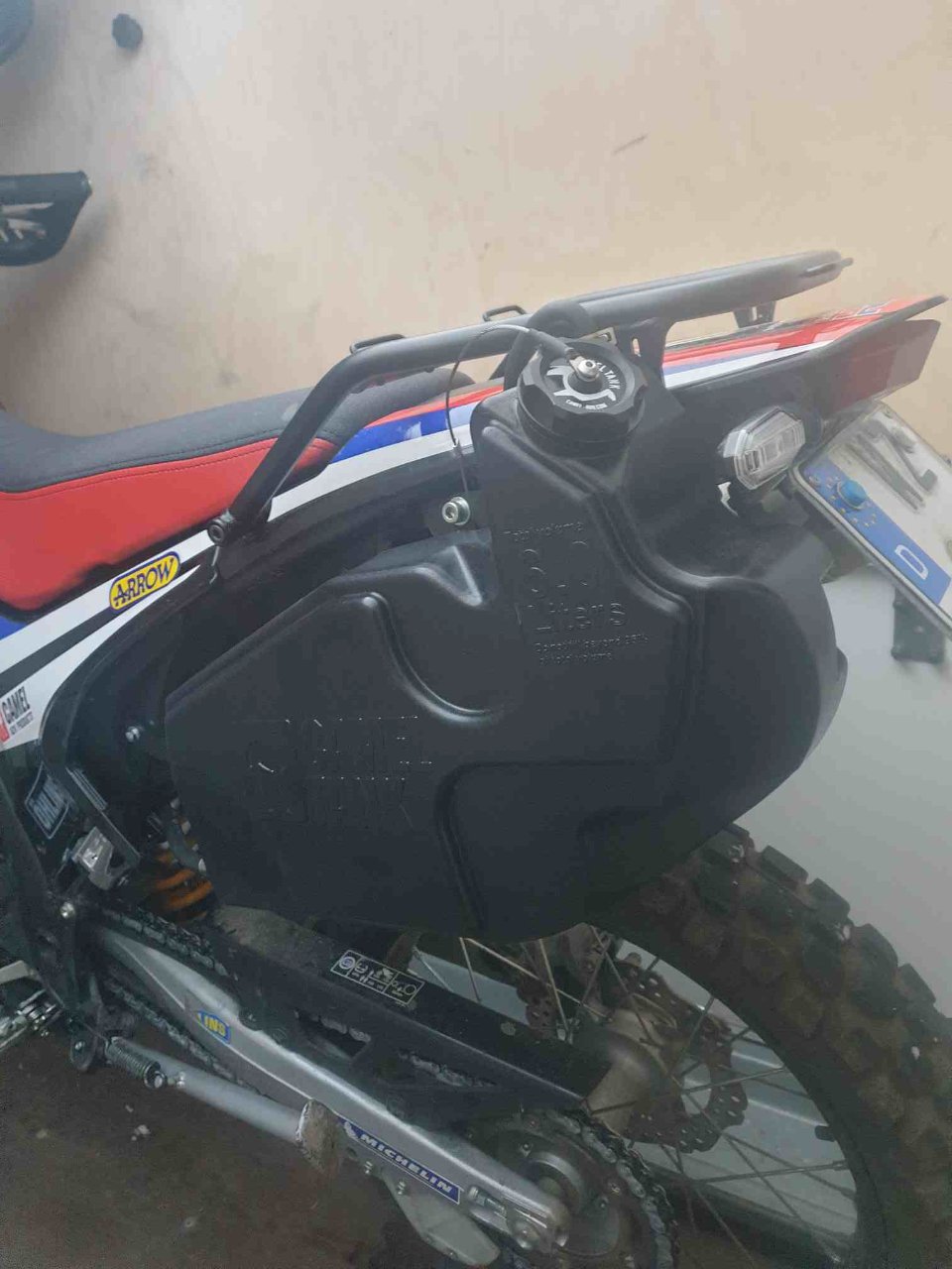 Habe mir an die CRF 250L einen Halter, für erstmal einen Fuel Friend gebaut. Das Material lag in der Garage. Das sind dann zwei Liter zur Beruhigung. Bei bedarf, wird die Werkzeugbox abgebaut und ein zweiter Fuel Friend hat platz. Das sind 4,0l plus.