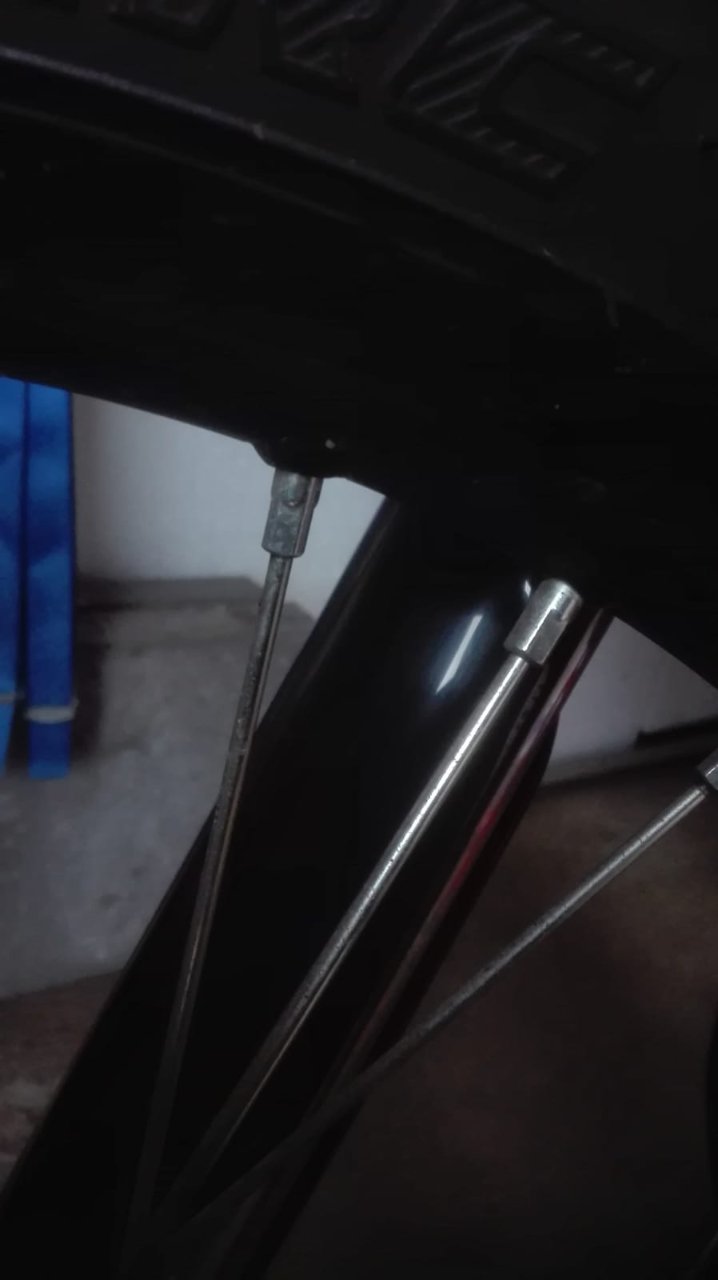 Eine sauber polierte Speiche und der Rest ist noch dreckig. Da mir Speichen putzen zu umständlich und zu aufwendig ist, sehen die bei mir immer so aus.