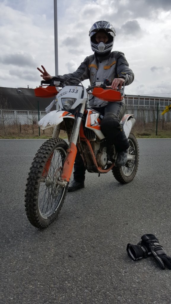 Vor dem Kursbeginn unterschreibt man eine Selbstbeteiligung von 1500 Euro. Soweit zum "mal eben das Motorrad wegschmeißen". Mit sieben Personen haben wir teilgenommen - eine Frau (das war ich) und ansonsten alles Männer mit ganz unterschiedlichen Lebensjahren und Vorkenntnissen. Eine echt nette Gruppe! Nach einer kurzen Vorstellungs- und Erwartungsmitteilungsrunde ging es direkt an die Leihmotorräder, die KTM Freeride 350.