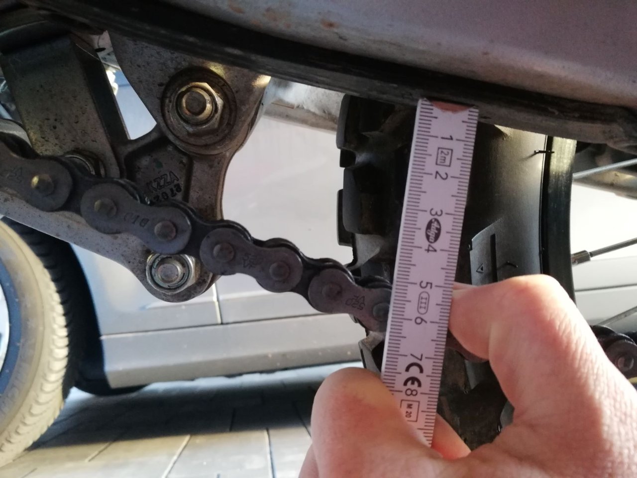 Am einfachsten geht es wenn du auf dem Motorrad sitzt. So kannst du die Kette oben an der Schwinge hochziehen. Ideal sind wenn du 2 Finger rein kriegst.