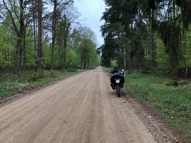 Am nächsten Morgen leider immer noch Regen. Nass abgebaut, nicht schön, aber muss ja. Dann bin ich ganz entspannt nach Greiffenberg geschlüsselt und dort auf den TET gefahren. Traumhaft. Ich bin Anfänger im Offroad Bereich, hab es langsam angehen lassen. Hatte manchmal schön die Hosen voll, und war auch plötzlich dankbar für den Regen, da der Brandenburger Sand wenigstens etwas fester war. Leider hab ich meine Hübsche auch mal abgelegt, aber Ross und Reiter hatten keine Schäden. Ich bin tatsächlich durch Dörfer gefahren, deren Mainroad wirklich noch aus einem Sandweg bestand, es war wie eine Zeitreise. Hätte mich nicht gewundert, wenn ich plötzlich auf einen Kradmelder der 9. Armee getroffen wäre, der mich fragt, ob ich schon die Panzerspitzen der 1. weißrussischen Front gesichtet habe.