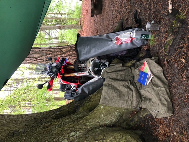Am späten Nachmittag dann in der Nähe von Fürstenberg/Havel runter vom TET und Nachtlager suchen. Naja, ihr wisst ja, zur Zeit nicht so einfach. Und ich konnte auch vorher nicht rausfinden, ob es als touristische Übernachtung gilt, wenn ich mit meinem Schlafsack im Wald liege. Nicht das mich das geschert hätte, aber interessiert hätte es mich. Nach einigem Googeln an der Tanke bei heissem Aral Kakao (lecker, Kaffee hatte ich schon zuviel an dem Tag) habe ich dann einen Campingplatz angesteuert, der als OFFEN! angezeigt war. Hat sich natürlich als Fehler herausgestellt, war alles verriegelt und verrammelt und mit den üblichen Infozetteln versehen, damit es auch der letzte Blödmann, der bei strömenden Regen dort vor der Tür steht, kapiert. Habe mich dann an den umliegenden Grundstücken freundlich durchgefragt und dann den entscheidenden Tipp bekommen, einfach noch einige hundert Meter in einen Wanderweg reinzufahren, da wären einige schöne Plätze an dem Havel(-arm), der in den See mündet. Dort angekommen habe ich ganz in Ruhe das Lager aufgeschlagen (sowas liebe ich ja!) und die tolle Natur bewundert. Später kam ein Angler vorbei, der mir reichlich selbstgemachten Met einschenkte. Der staunte nicht schlecht über meine Rally und wir hatten ein nettes Benzingespräch über seine alte Afrika Twin, seine ehemalige KTM competition usw.. Dann war ich für den Rest des Abends allein und hab’s mir hübsch gemacht. Bevor ich losfuhr hatte ich ein vages Drängen in mir, mal wieder rauszumüssen aus diesem Coronagefängnis aus Arbeit(die ich eigentlich sehr gern mache), schlafen und sonst nicht viel mehr. Außer meiner lieben Familie. Kurzum, als ich so dort saß, mein Zelt und meine völlig verschlammte Honda neben mir, hatte ich echt Glücksgefühle, und mir wurde klar, wie lange sowas schon überfällig war.