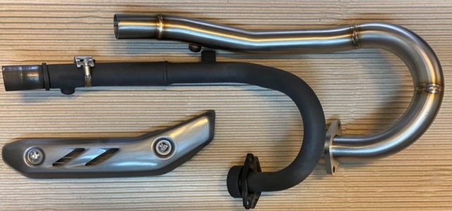 Krümmer: Man kann recht deutlich sehen, dass der Durchmesser des Arrow-Krümmers deutlich größer ist, als der des Serienkrümmers. Ich würde mal sagen der Außendurchmesser des Serienkrümmers an der schmalsten ist kleiner als der Innendurchmesser des Arrow-Krümmers. Der Arrow-Krümmer hat auch eine etwas andere Linienführung als das Serienteil. Das Original-Hitzeschild wird über zwei Schellen befestigten kann dabei weiter vorne oder, wie beim Original-Krümmer, nahe am Haupt-Rahmen montiert werden. Anders als auf dem Foto, habe ich das Hitzeschild final wie das Serienteil positioniert. Die Schweißnähte am Krümmer sind zwar nicht schlecht, aber doch ein gutes Stück von dem entfernt, was Akrapovic so aus dem Schweißroboter zaubert.