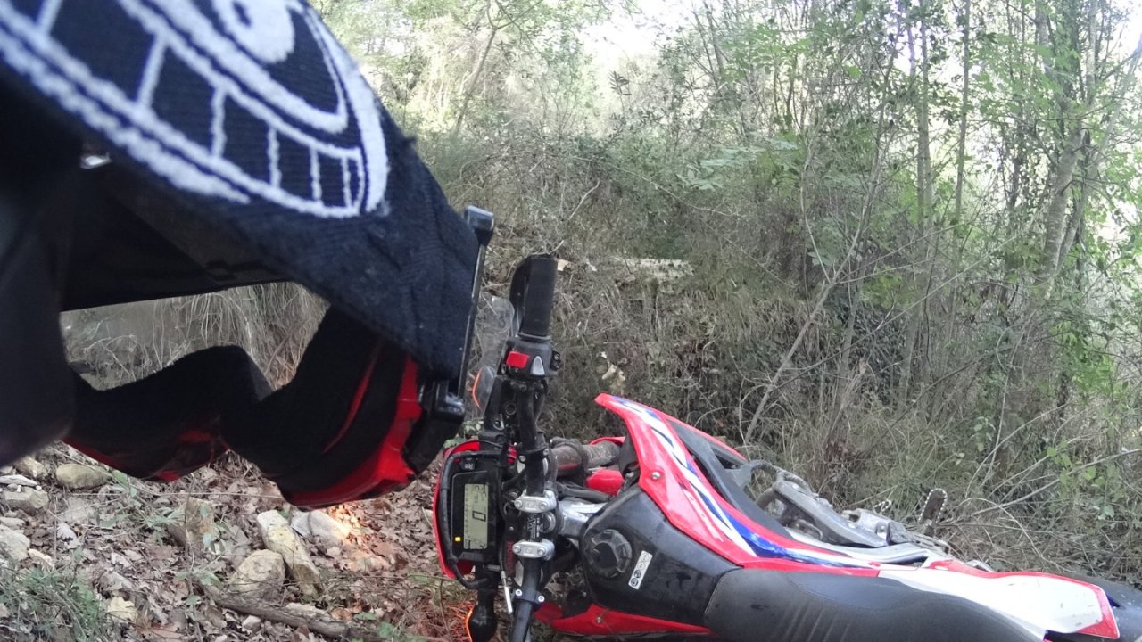 Am Donnerstag dann wollten meine Arme von Anfang an nicht mehr. Wir sind den MTB Track vom Vortag wieder hoch, weil einer seine Handschuhe dort verloren hatte. Auf Weg einen anderen Track wieder runter ist mir dann ein Malheur passiert. Rechtskurve zu weit gefahren, auf Steine rauf gekommen, Kontrolle verloren und einen ca 60cm Vorsprung runter gefallen. Ich bin frontal auf eine glatte Steinplatte drauf, da haben die Protektoren ganze Arbeit geleistet. Mein Motorrad hat sich auf den Kopf gestellt und lag dann entgegen der Fahrtrichtung.