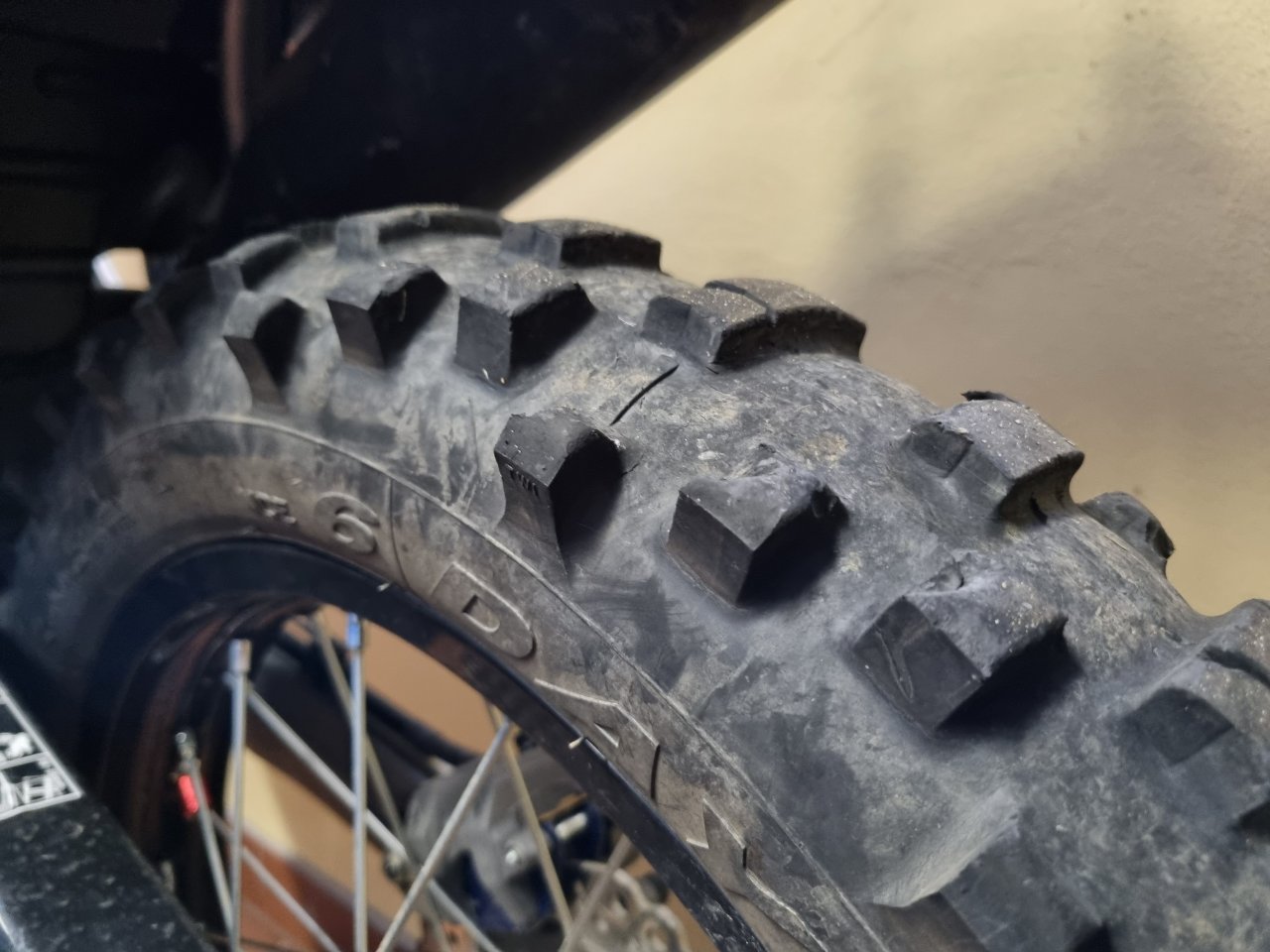 Geht davon aus, dass was kaputt geht. Grobe Stollenreifen (á là Six days extreme) sind absolute Pflicht. Die Reifen sind nach so einer Tour ca halb runter gefahren. Vorne ist die Profiltiefe noch gerade so okay aber an allen Blöcken sind Ausbrüche, teils erheblich (>50% weg gebrochen). Hinten ist die übrig gebliebene Profiltiefe geradezu lächerlich und die äußeren Zähne haben unterschiedlich starke Ausbrüche. In meinem Fall zusätzlich: