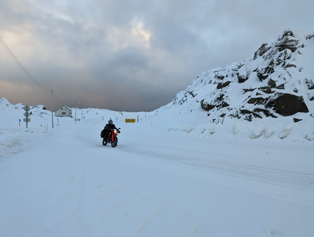 Leider ist mir nachmdem Tanken wiedermal die Sicherung vom Heizvisier abgekakt und ich musste sie wieder wechseln. Allerdings an einem Wunderschönen Ort. Zuerst wollten wir erst in Hõningsvåg ins Hotel und nach dem Gepäck deponieren gleich zum Nordkap hoch. Da es wieder zu schneien begann entschieden wir uns gleich hochzufahren.
